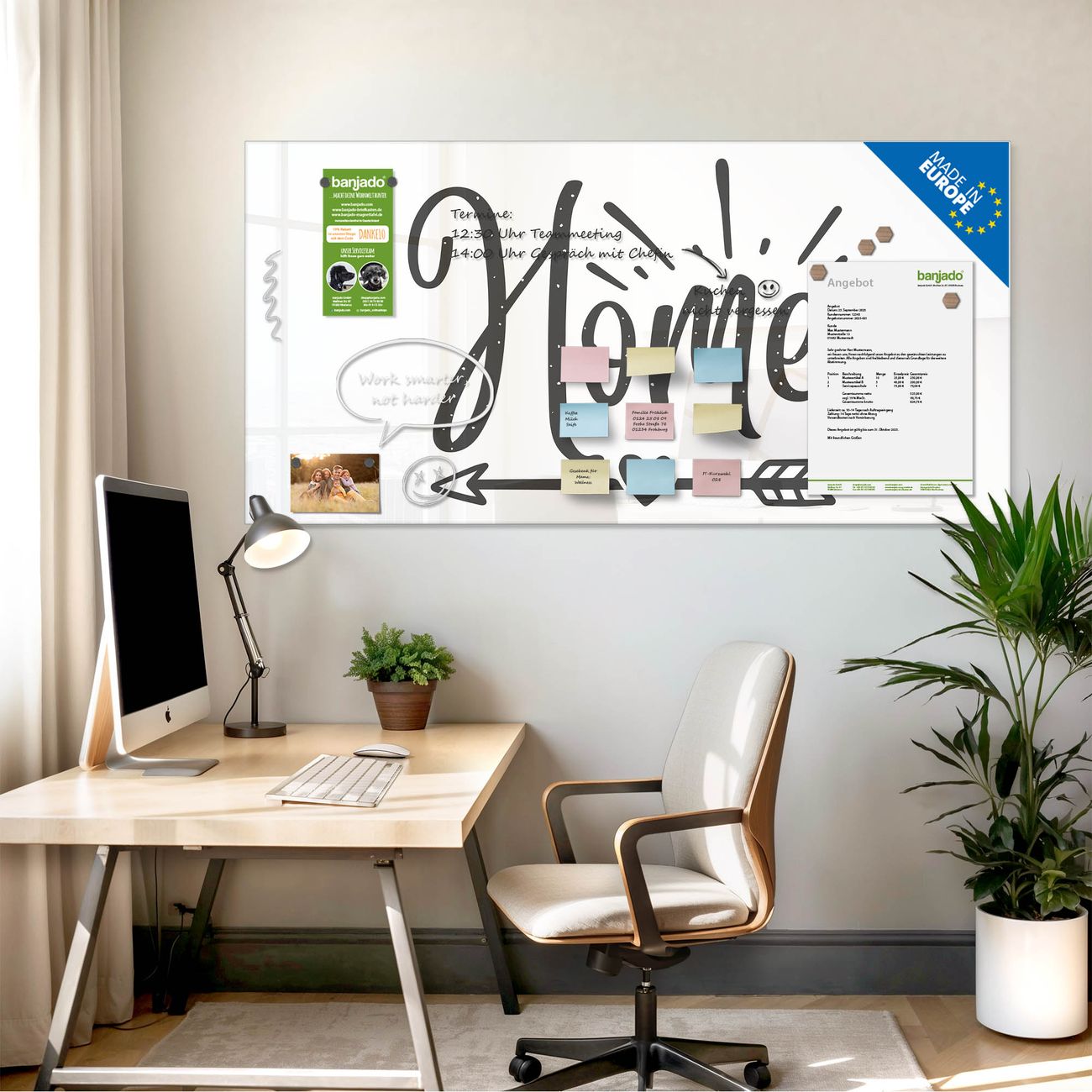 Jede Glas Magnettafel wird in unserer Werkstatt von Hand gefertigt und sorgfältig geprüft. So erhalten Sie ein echtes Qualitätsprodukt, das Funktion und Ästhetik perfekt vereint.?? Warum banjado?
