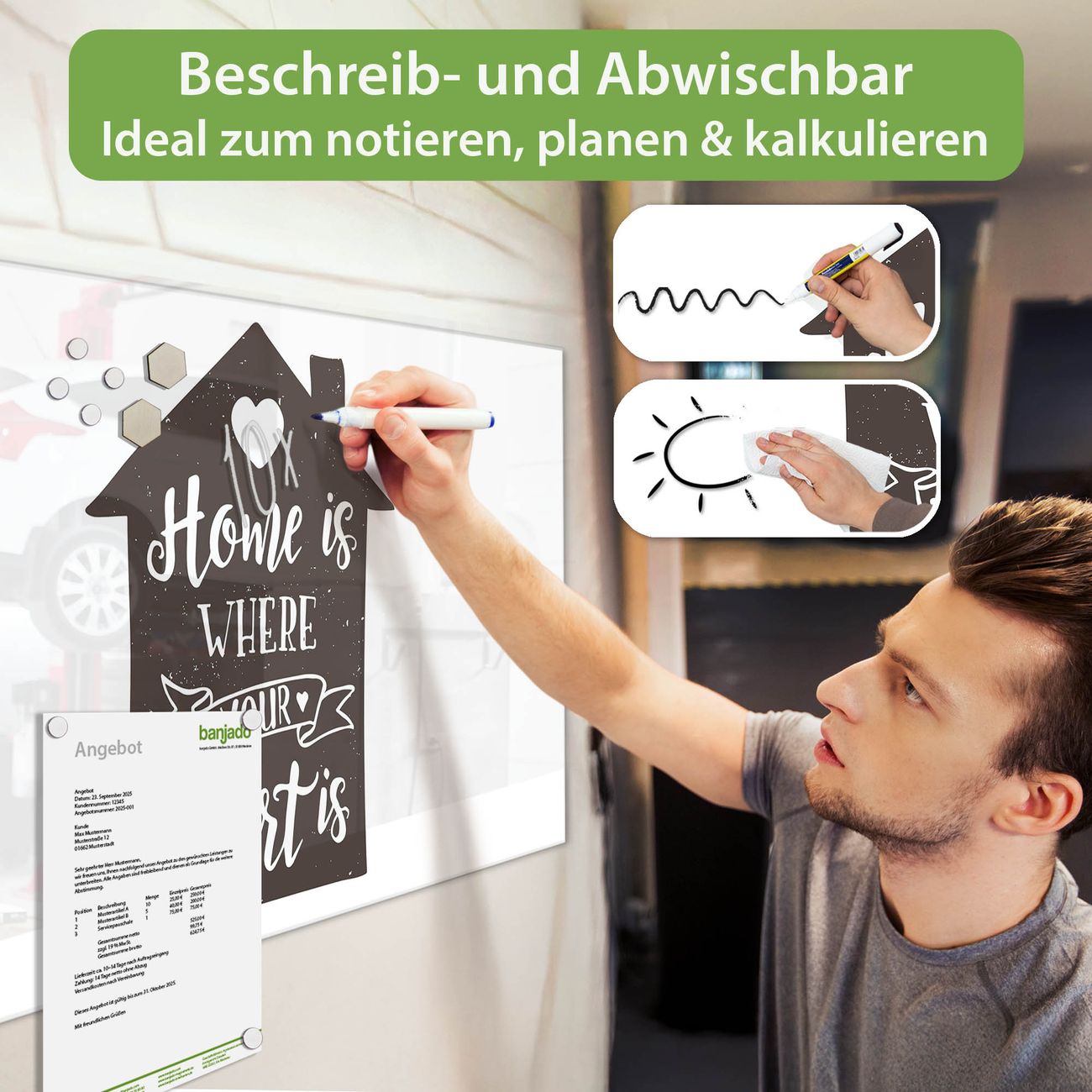Bitte beachten Sie, dass ausschliessliche spezielle Magnete an der Glastafel haften. Wir empfehlen banjado Neodym Magnete, diese sind durch uns auf Wirksamkeit geprüft.
