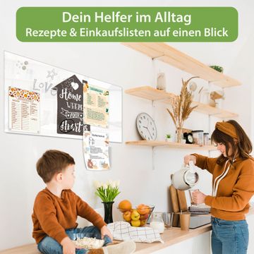 Auf der glatten Glasoberfläche lassen sich Termine, Rezepte oder Notizen ganz einfach mit Kreidestiften festhalten und rückstandslos entfernen. Starke Neodym-Magnete halten Ihre wichtigsten Erinnerungen sicher an Ort und Stelle. So entsteht Ihre ganz persönliche Ideenwand - jeden Tag neu.