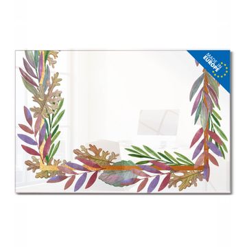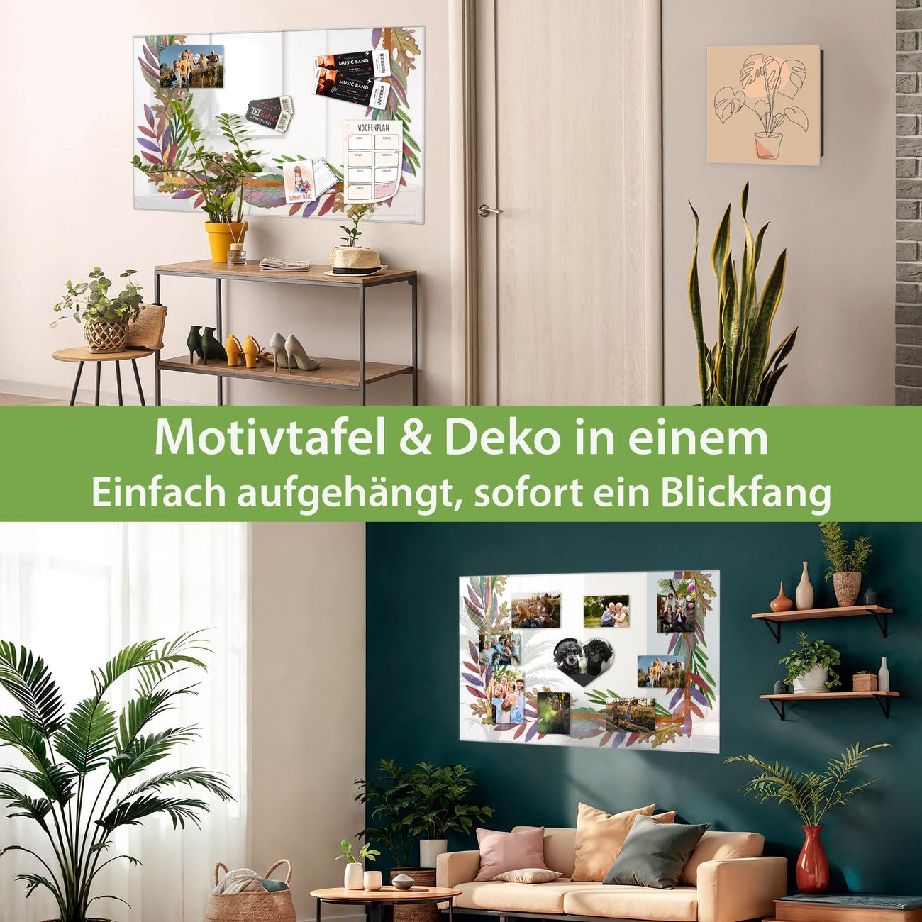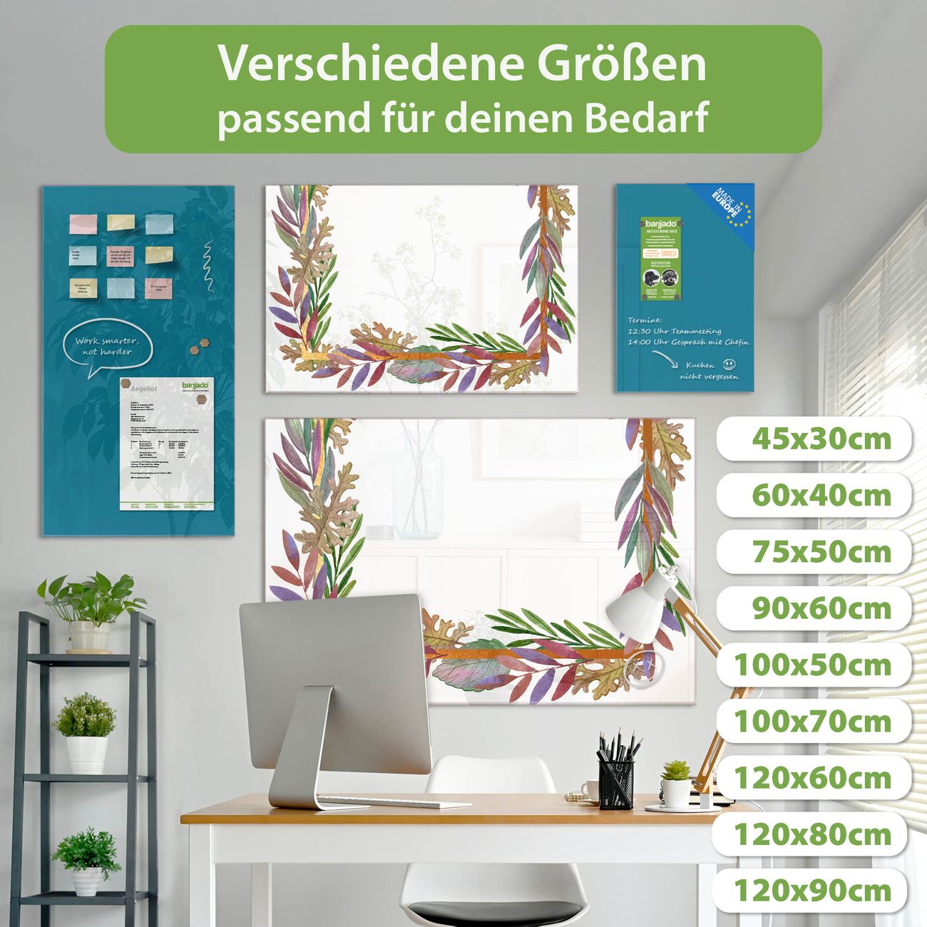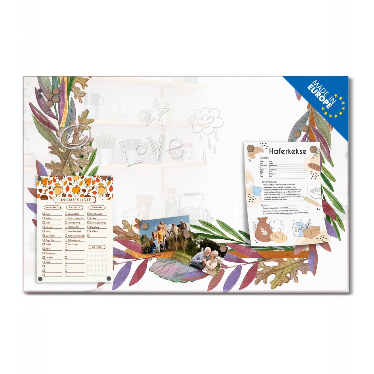 Material: 4mm Sicherheitsglas mit Metallrückwand Eigenschaften: beschreibbar, magnetisch, kratzfest Maße: 75x50x0,6cm, 5,63kg schwer Motiv Nummer 13508 Herbstliche Blattgirlande Zubehör: inklusive 4 Neodym-Magnete