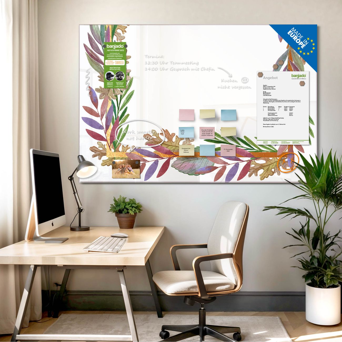 Die banjado Glas Magnettafel mit dem Motiv Motiv Herbstliche Blattgirlande verbindet Funktionalität mit Stil. Sie ersetzt das Zettelchaos durch klare Strukturen und bringt dabei eine warme, natürliche Atmosphäre in Ihr Zuhause. Ob im Büro, in der Küche oder im Eingangsbereich - dieses Design-Board zieht Blicke an und sorgt für Ordnung mit Charakter.