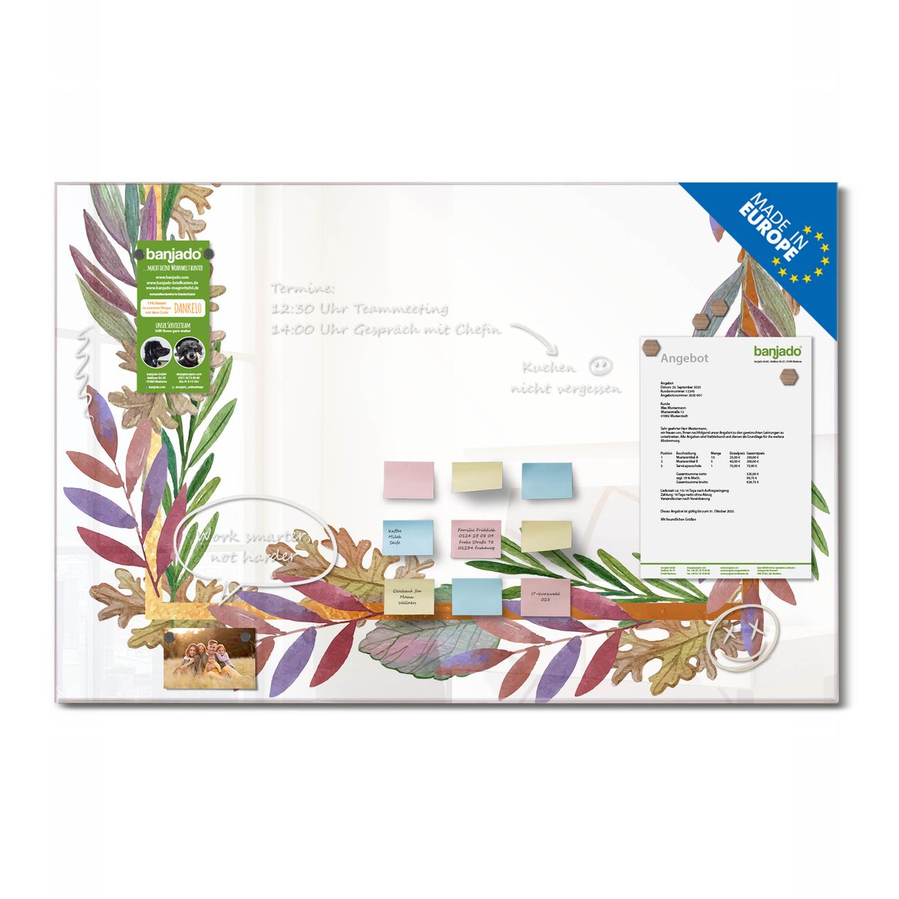Material: 4mm Sicherheitsglas mit Metallrückwand Eigenschaften: beschreibbar, magnetisch, kratzfest Maße: 120x80x0,6cm, 14,40kg schwer Motiv Nummer 13508 Herbstliche Blattgirlande Zubehör: inklusive 4 Neodym-Magnete