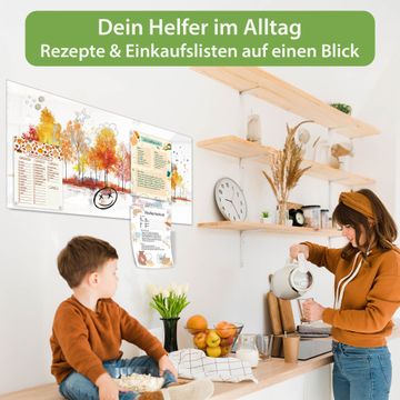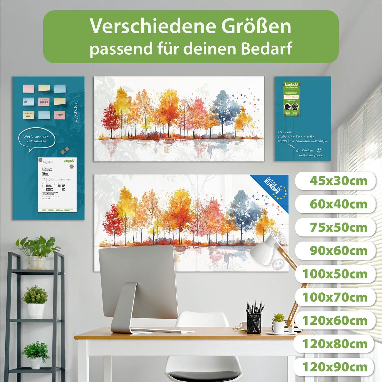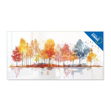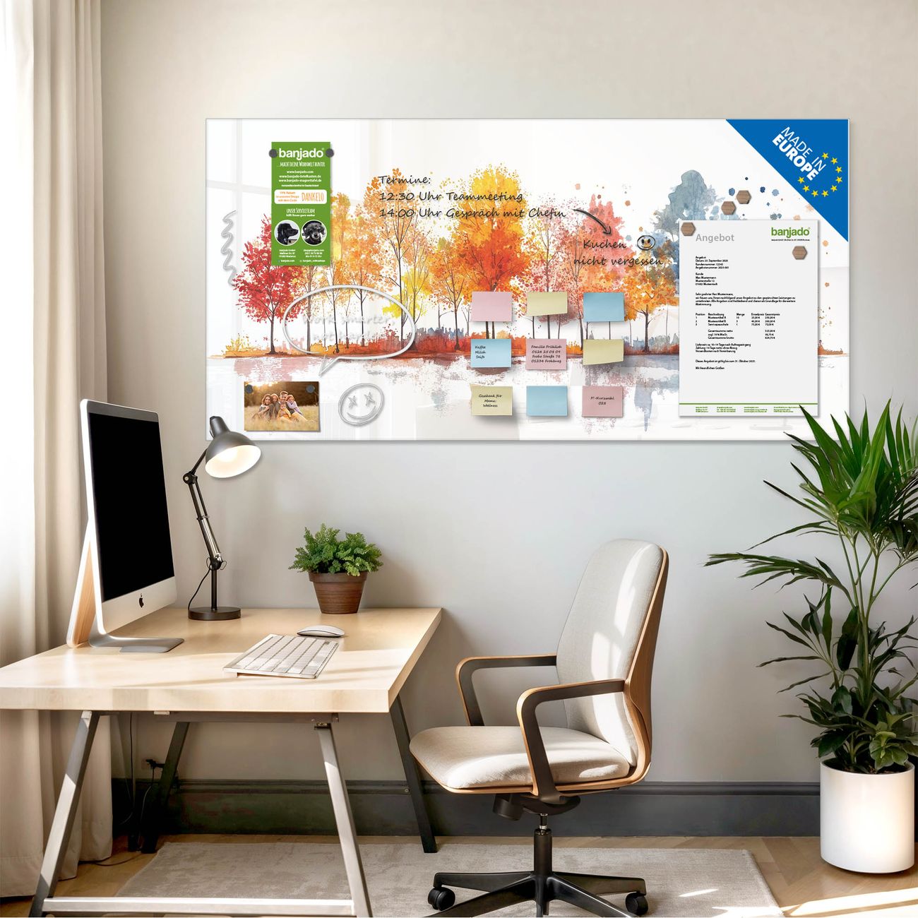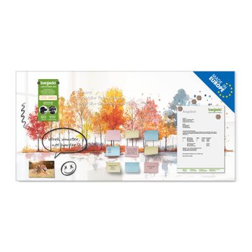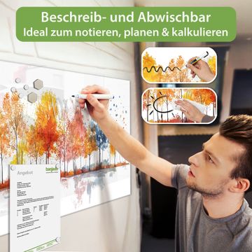 Material: 4mm Sicherheitsglas mit Metallrückwand Eigenschaften: beschreibbar, magnetisch, kratzfest Maße: 100x50x0,6cm, 7,50kg schwer Motiv Nummer 13279 Herbstlicher Baumzauber Zubehör: inklusive 4 Neodym-Magnete