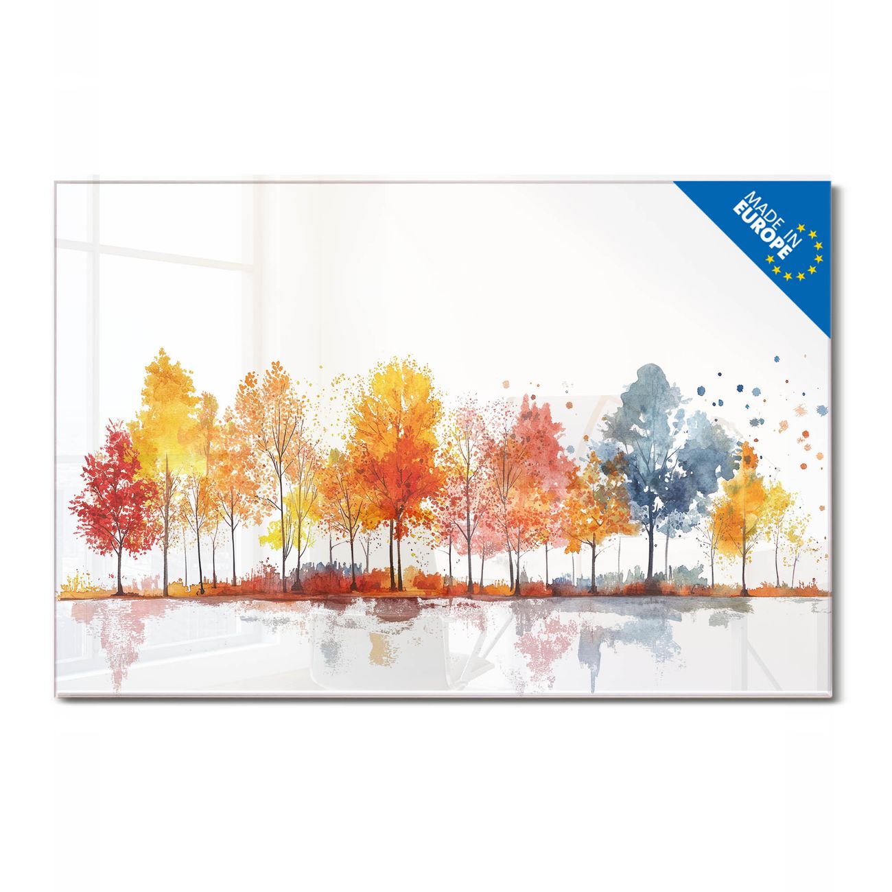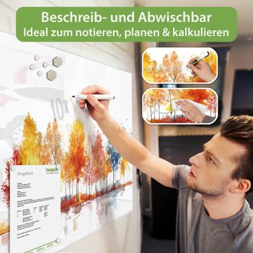 Material: 4mm Sicherheitsglas mit Metallrückwand Eigenschaften: beschreibbar, magnetisch, kratzfest Maße: 120x80x0,6cm, 14,40kg schwer Motiv Nummer 13279 Herbstlicher Baumzauber Zubehör: inklusive 4 Neodym-Magnete