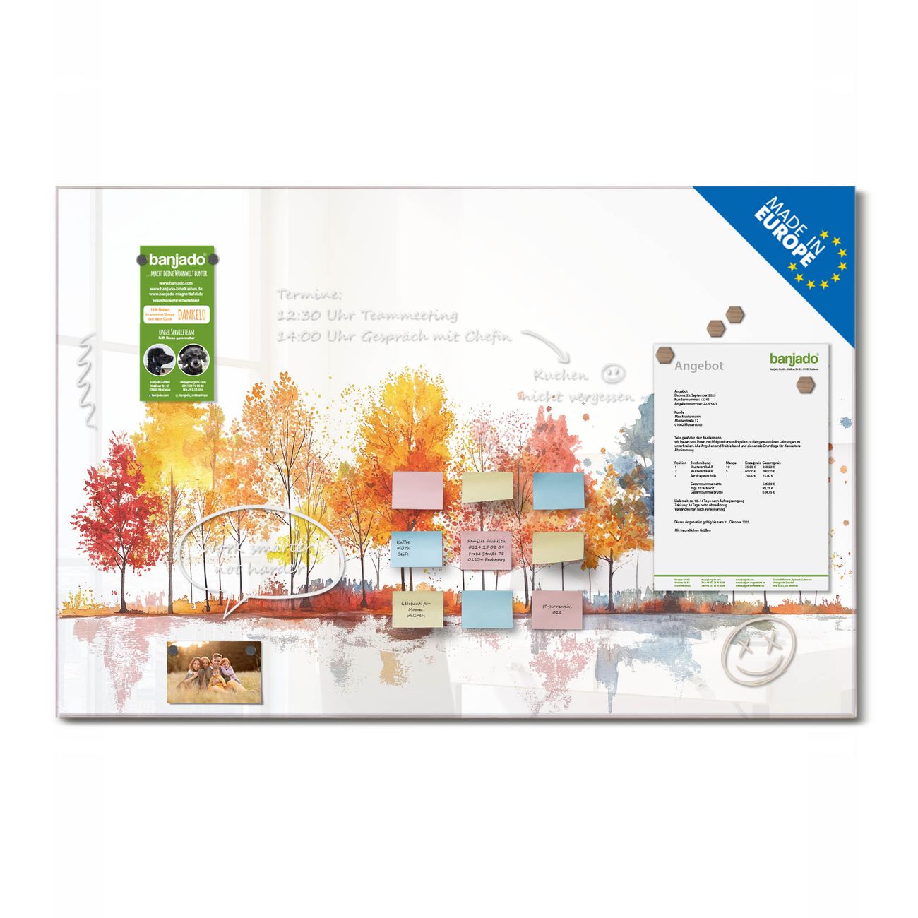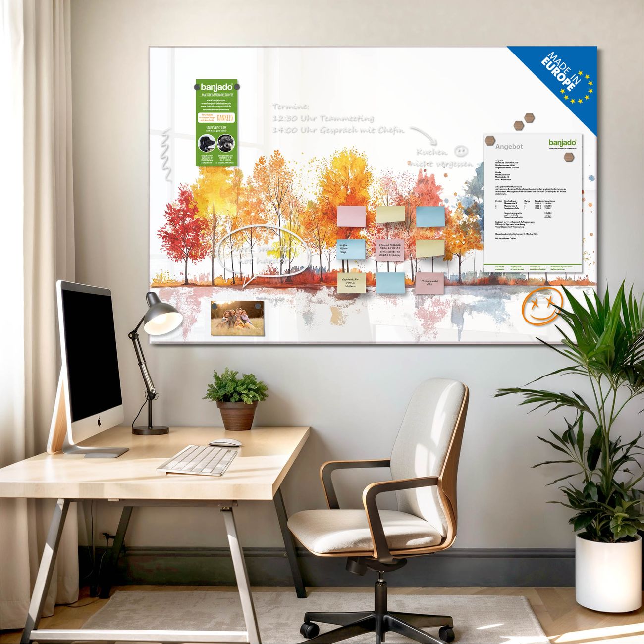Jede Glas Magnettafel wird in unserer Werkstatt von Hand gefertigt und sorgfältig geprüft. So erhalten Sie ein echtes Qualitätsprodukt, das Funktion und Ästhetik perfekt vereint.?? Warum banjado?