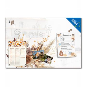 Material: 4mm Sicherheitsglas mit Metallrückwand Eigenschaften: beschreibbar, magnetisch, kratzfest Maße: 75x50x0,6cm, 5,63kg schwer Motiv Nummer 13525 Herbstlicher Blumenstrauß Zubehör: inklusive 4 Neodym-Magnete