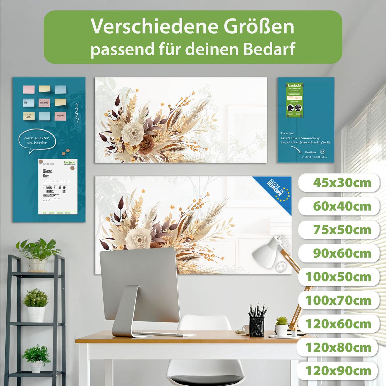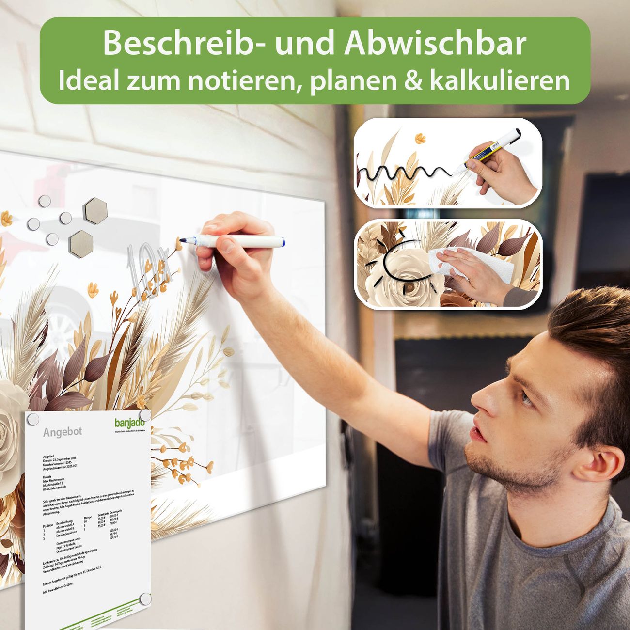 Jede Glas Magnettafel wird in unserer Werkstatt von Hand gefertigt und sorgfältig geprüft. So erhalten Sie ein echtes Qualitätsprodukt, das Funktion und Ästhetik perfekt vereint.?? Warum banjado?