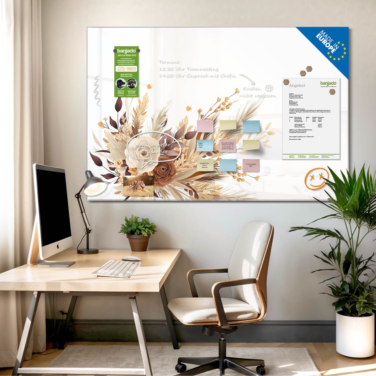 Ein Stück Design, das Ihren Alltag organisiert. Schreiben, heften, inspirieren - alles an einem Ort. Qualität, die man spürt. Montage leicht gemacht. Handwerk mit Herz - veredelt in Sachsen. Einzigartiges Design mit Motiv Motiv Herbstlicher Blumenstrauß Beschreibbare Glasoberfläche, leicht zu reinigen Starke Magnetkraft durch Stahlrückwand Inklusive 4 Neodym-Magneten Flexible Montageoptionen Handveredelt in Sachsen - Qualität, die bleibt