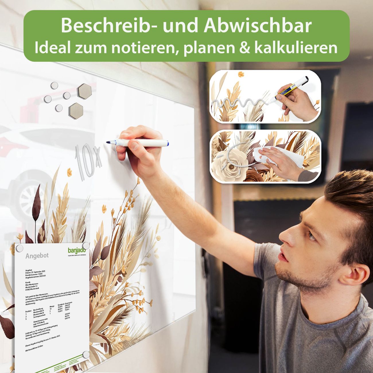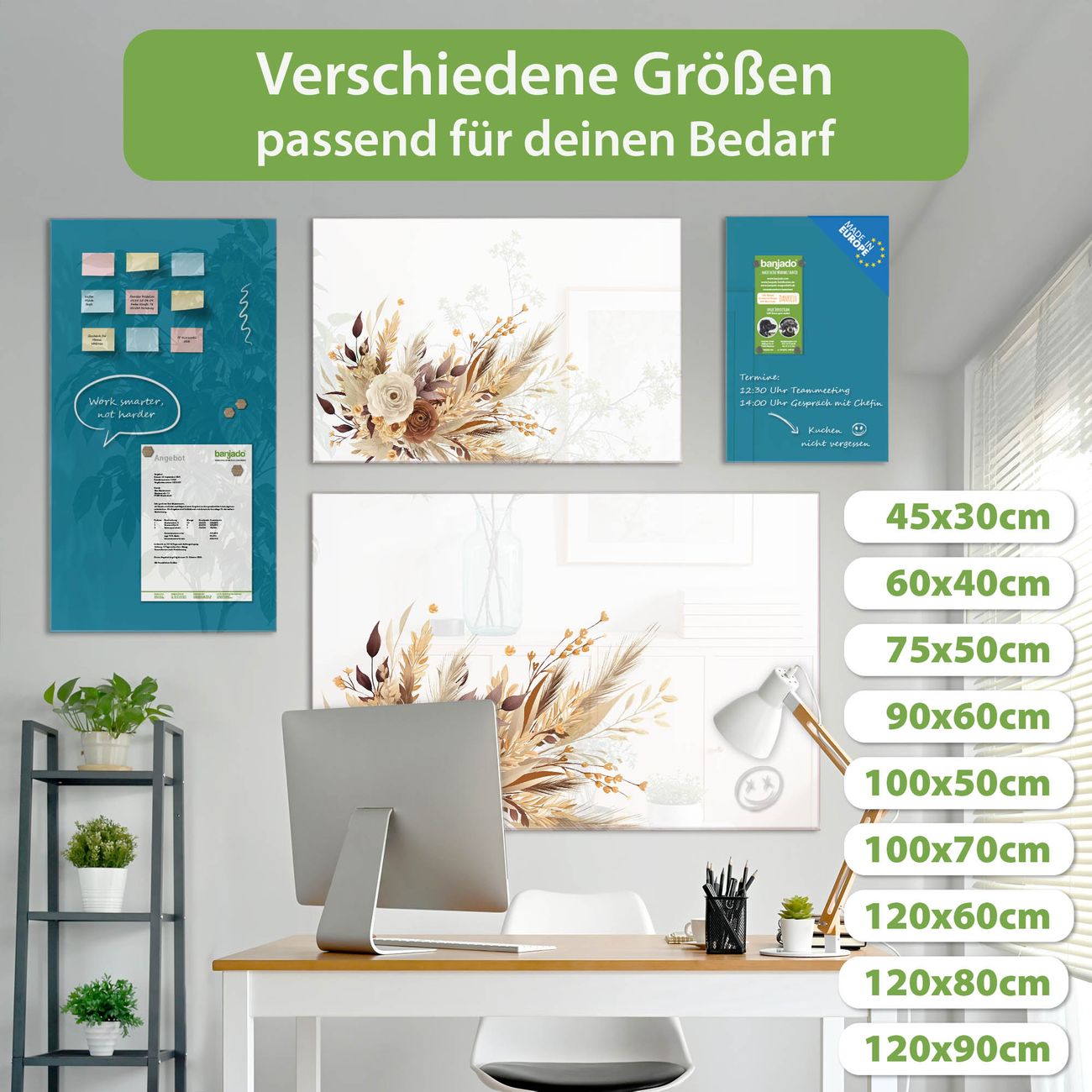 Jede Glas Magnettafel wird in unserer Werkstatt von Hand gefertigt und sorgfältig geprüft. So erhalten Sie ein echtes Qualitätsprodukt, das Funktion und Ästhetik perfekt vereint.?? Warum banjado?