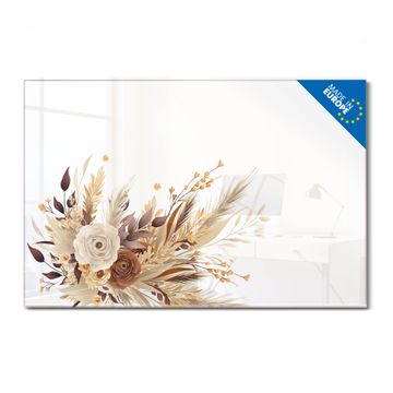 Material: 4mm Sicherheitsglas mit Metallrückwand Eigenschaften: beschreibbar, magnetisch, kratzfest Maße: 120x80x0,6cm, 14,40kg schwer Motiv Nummer 13525 Herbstlicher Blumenstrauß Zubehör: inklusive 4 Neodym-Magnete
