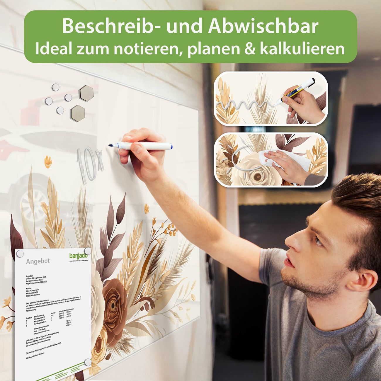 Jede Glas Magnettafel wird in unserer Werkstatt von Hand gefertigt und sorgfältig geprüft. So erhalten Sie ein echtes Qualitätsprodukt, das Funktion und Ästhetik perfekt vereint.?? Warum banjado?