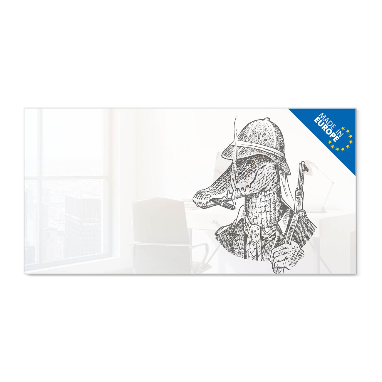 Material: 4mm Sicherheitsglas mit Metallrückwand Eigenschaften: beschreibbar, magnetisch, kratzfest Maße: 100x50x0,6cm, 7,50kg schwer Motiv Nummer 13090 Herr Krokodil 2 Zubehör: inklusive 4 Neodym-Magnete