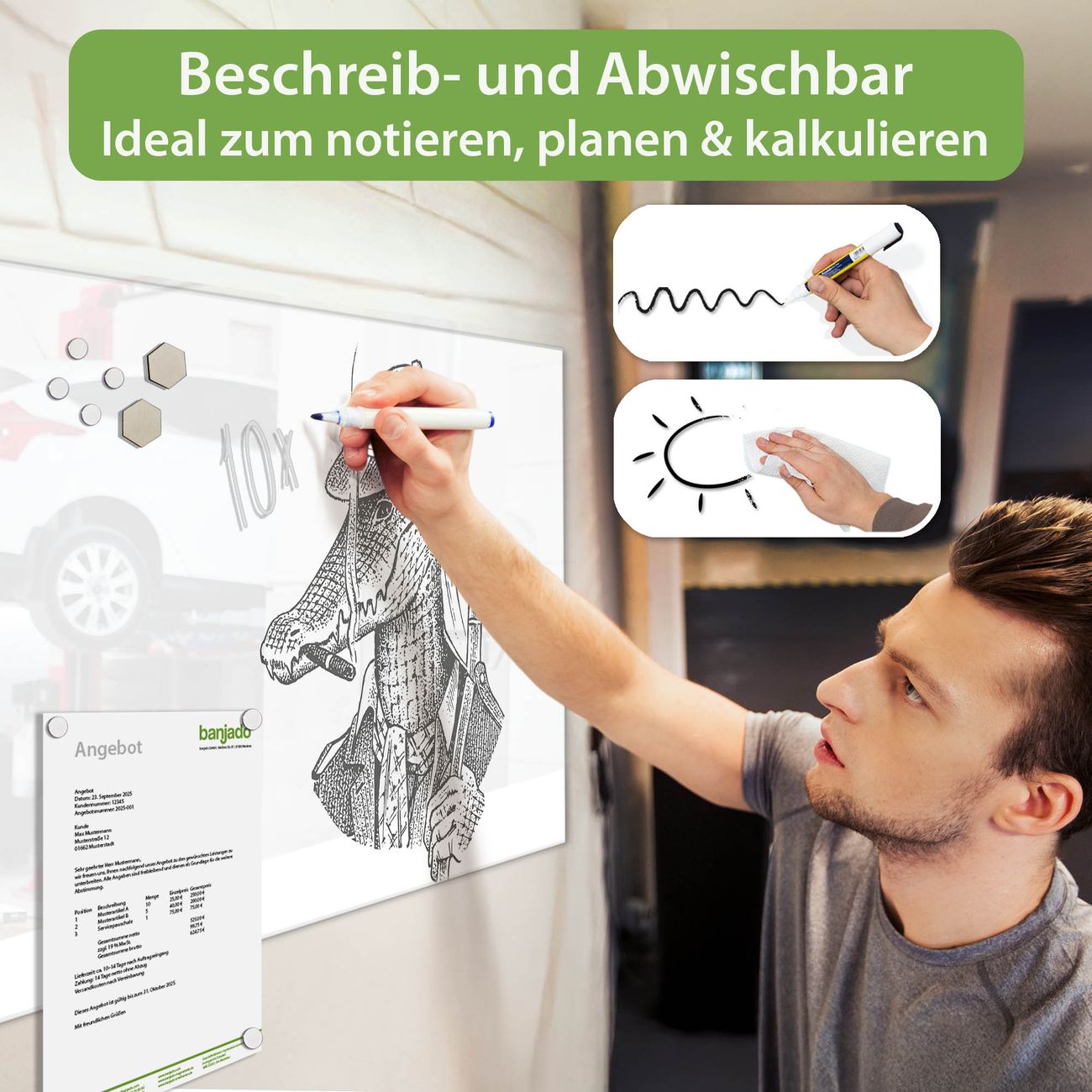 Bitte beachten Sie, dass ausschliessliche spezielle Magnete an der Glastafel haften. Wir empfehlen banjado Neodym Magnete, diese sind durch uns auf Wirksamkeit geprüft.