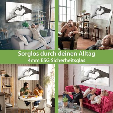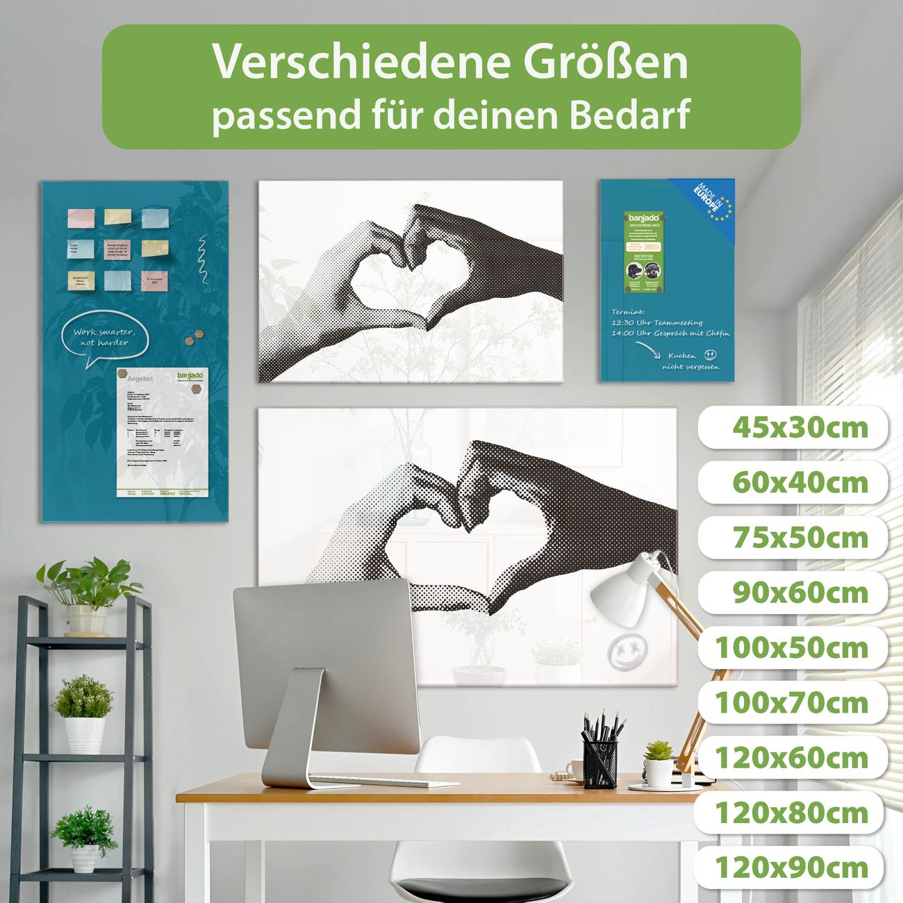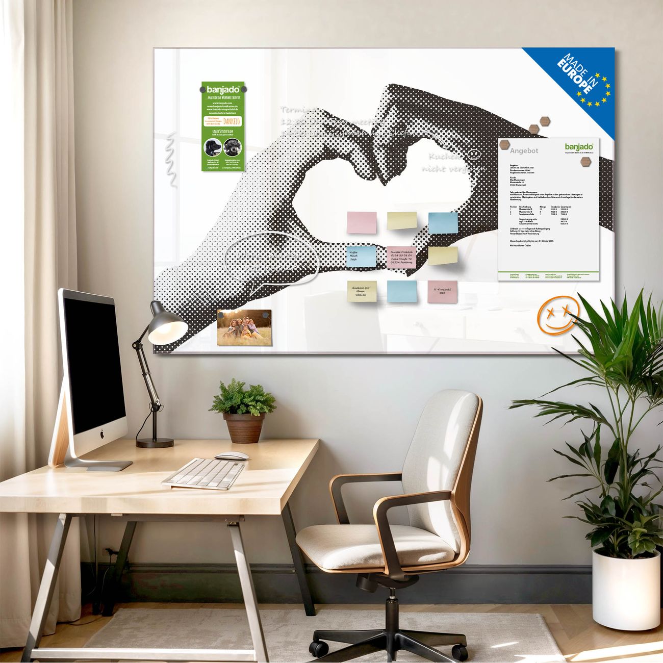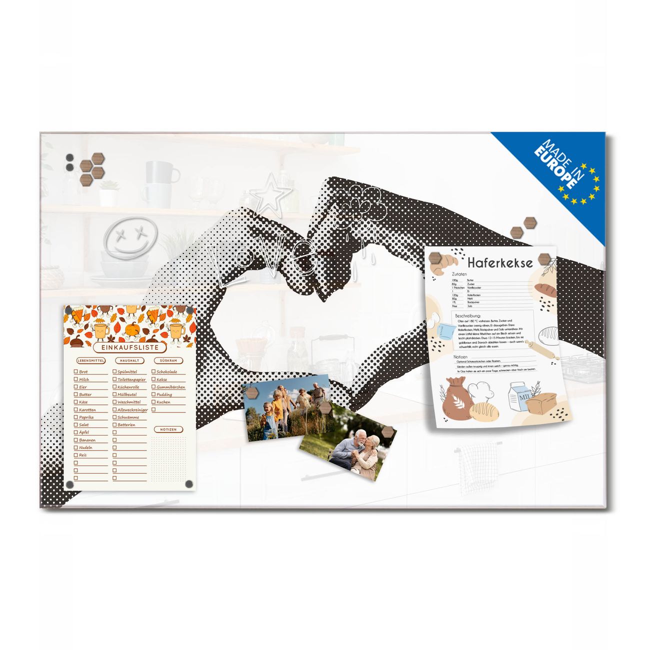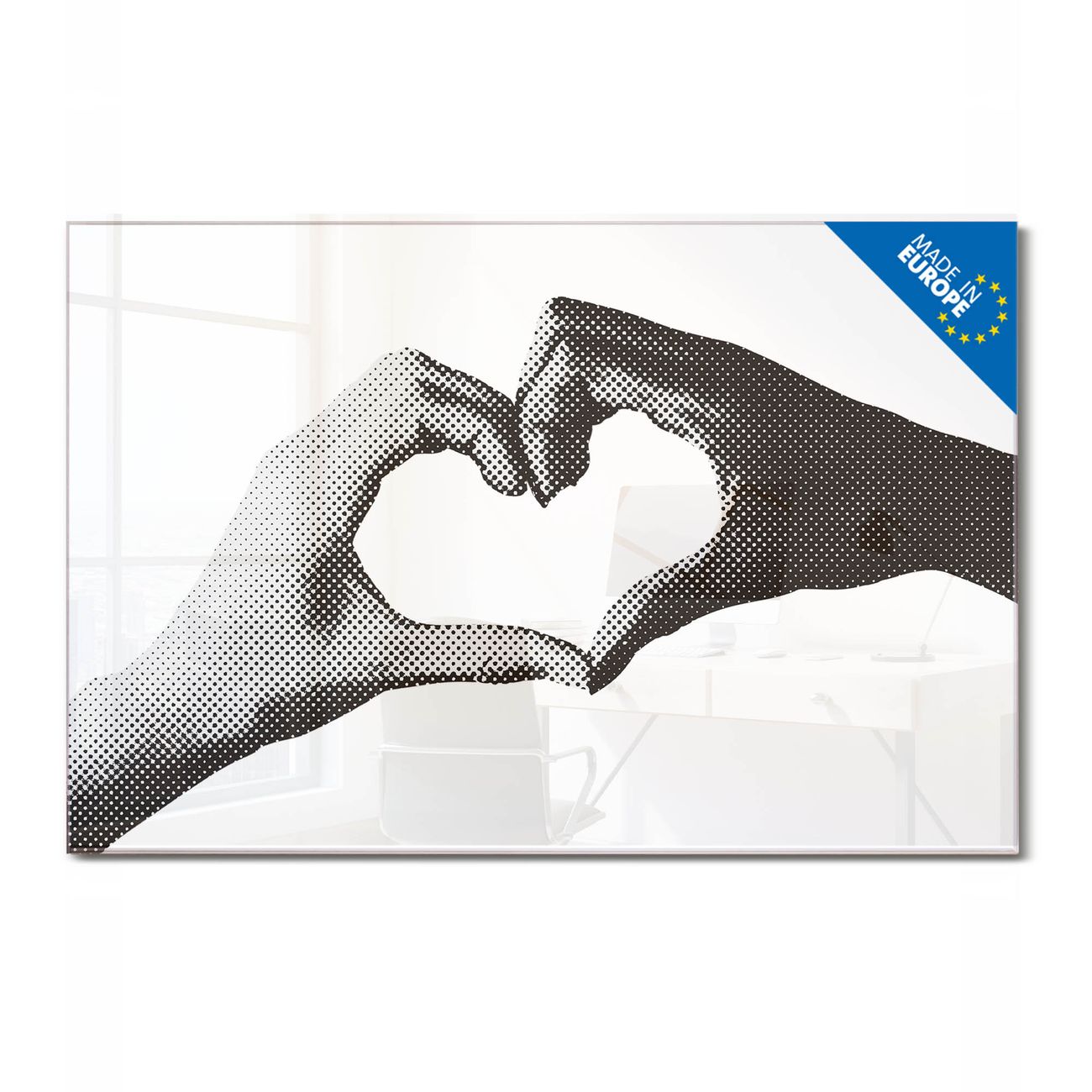 Material: 4mm Sicherheitsglas mit Metallrückwand Eigenschaften: beschreibbar, magnetisch, kratzfest Maße: 90x60x0,6cm, 8,10kg schwer Motiv Nummer 13180 Herzhände Zubehör: inklusive 4 Neodym-Magnete