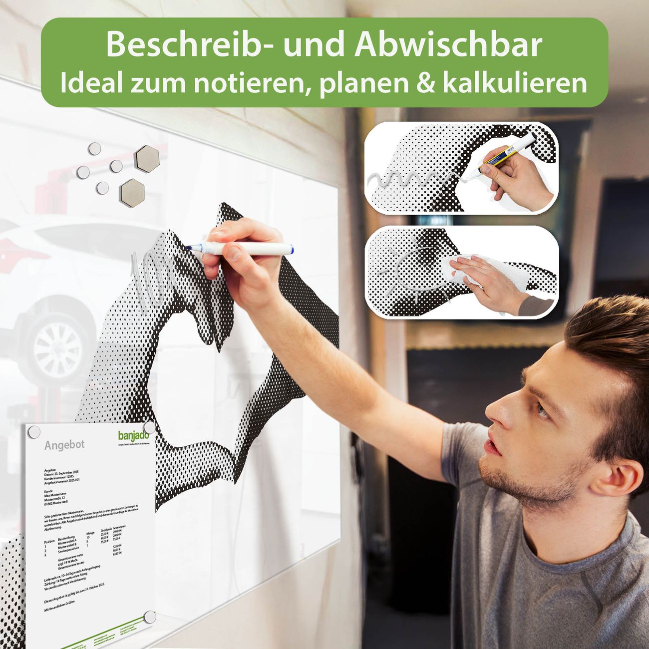 Jede Glas Magnettafel wird in unserer Werkstatt von Hand gefertigt und sorgfältig geprüft. So erhalten Sie ein echtes Qualitätsprodukt, das Funktion und Ästhetik perfekt vereint.?? Warum banjado?