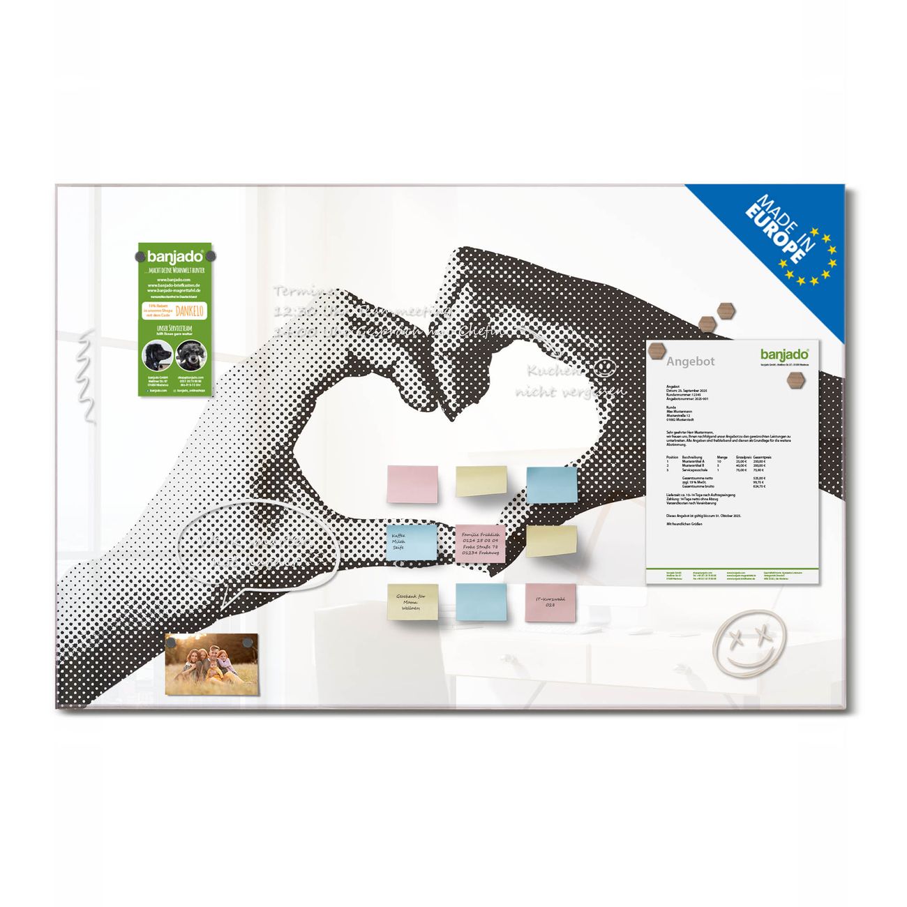 Material: 4mm Sicherheitsglas mit Metallrückwand Eigenschaften: beschreibbar, magnetisch, kratzfest Maße: 120x80x0,6cm, 14,40kg schwer Motiv Nummer 13180 Herzhände Zubehör: inklusive 4 Neodym-Magnete