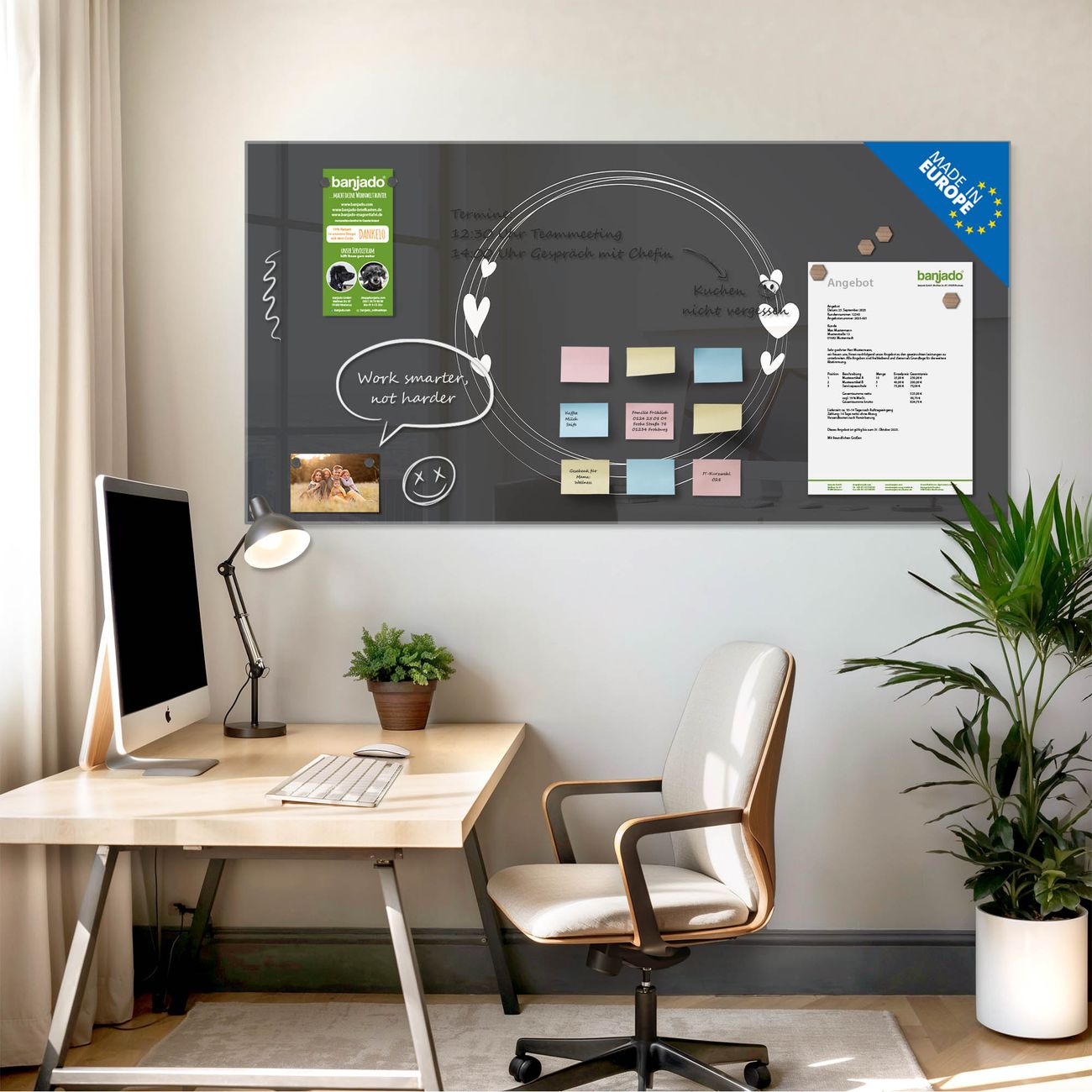 Jede Glas Magnettafel wird in unserer Werkstatt von Hand gefertigt und sorgfältig geprüft. So erhalten Sie ein echtes Qualitätsprodukt, das Funktion und Ästhetik perfekt vereint.?? Warum banjado?