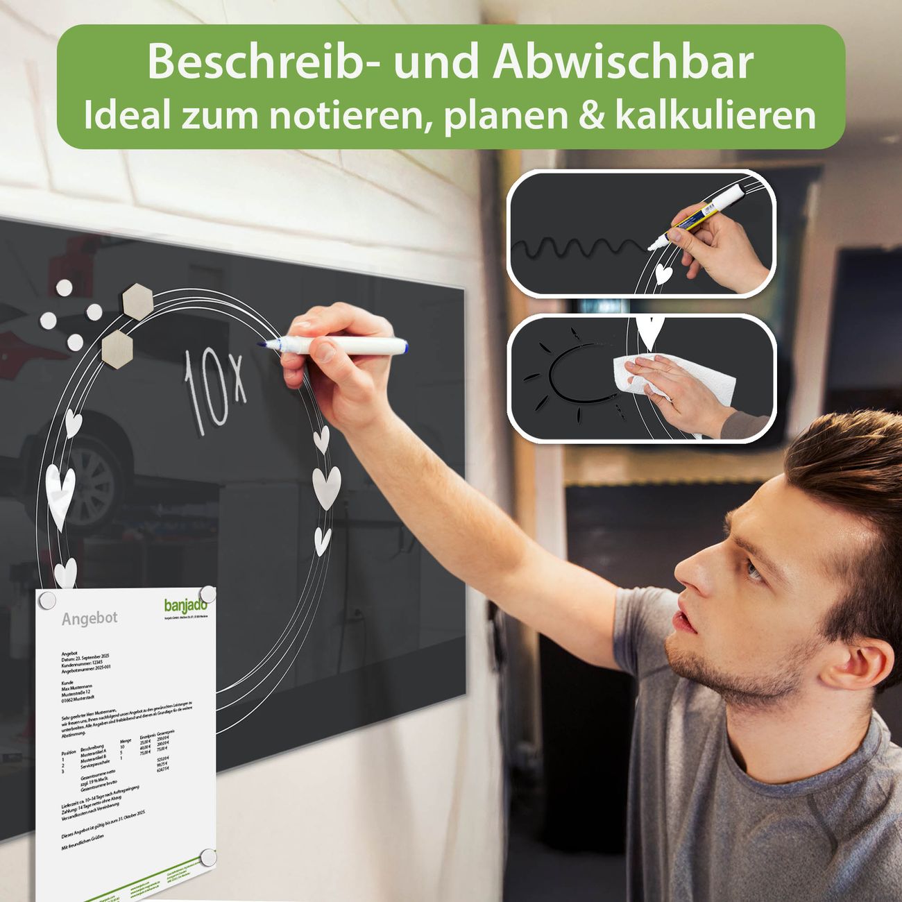 Bitte beachten Sie, dass ausschliessliche spezielle Magnete an der Glastafel haften. Wir empfehlen banjado Neodym Magnete, diese sind durch uns auf Wirksamkeit geprüft.