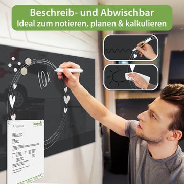 Auf der glatten Glasoberfläche lassen sich Termine, Rezepte oder Notizen ganz einfach mit Kreidestiften festhalten und rückstandslos entfernen. Starke Neodym-Magnete halten Ihre wichtigsten Erinnerungen sicher an Ort und Stelle. So entsteht Ihre ganz persönliche Ideenwand - jeden Tag neu.