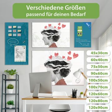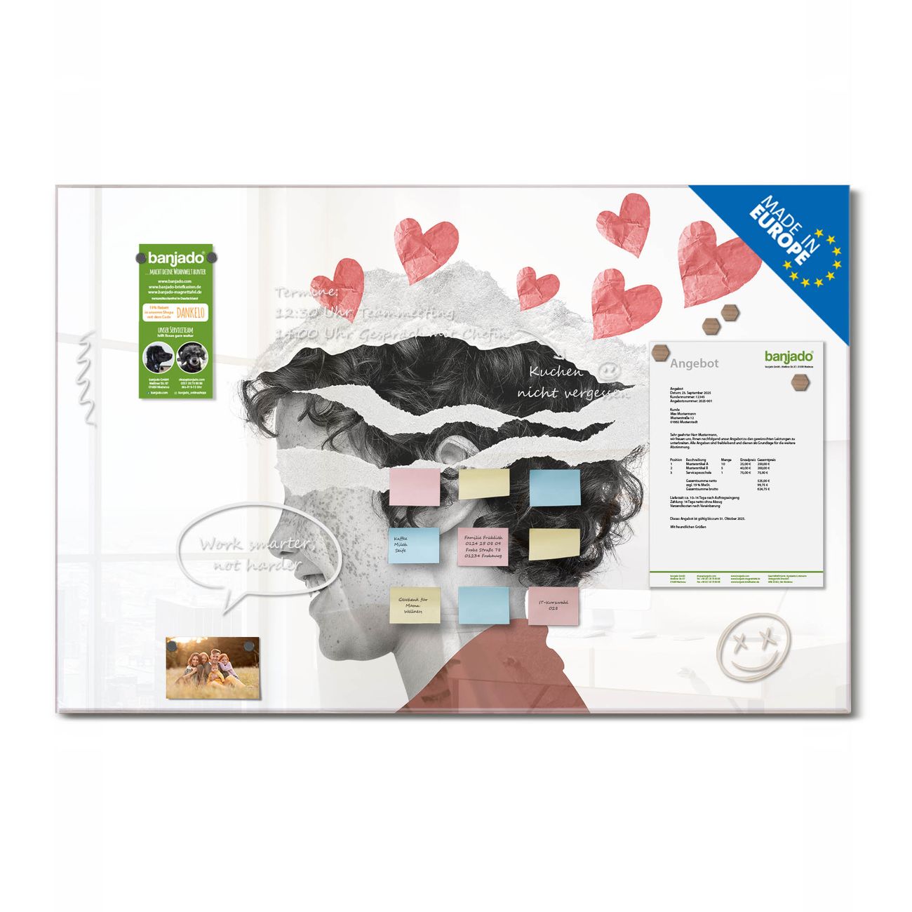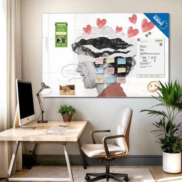 Material: 4mm Sicherheitsglas mit Metallrückwand Eigenschaften: beschreibbar, magnetisch, kratzfest Maße: 120x80x0,6cm, 14,40kg schwer Motiv Nummer 13377 Herzvoller Gedanke Zubehör: inklusive 4 Neodym-Magnete