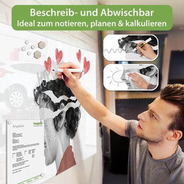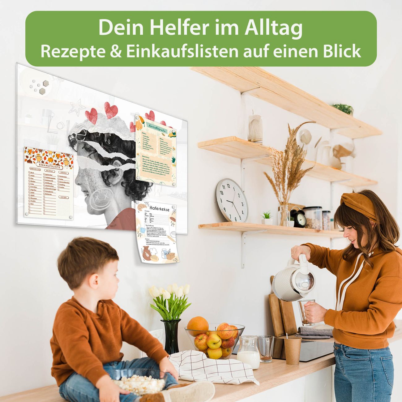 Auf der glatten Glasoberfläche lassen sich Termine, Rezepte oder Notizen ganz einfach mit Kreidestiften festhalten und rückstandslos entfernen. Starke Neodym-Magnete halten Ihre wichtigsten Erinnerungen sicher an Ort und Stelle. So entsteht Ihre ganz persönliche Ideenwand - jeden Tag neu.