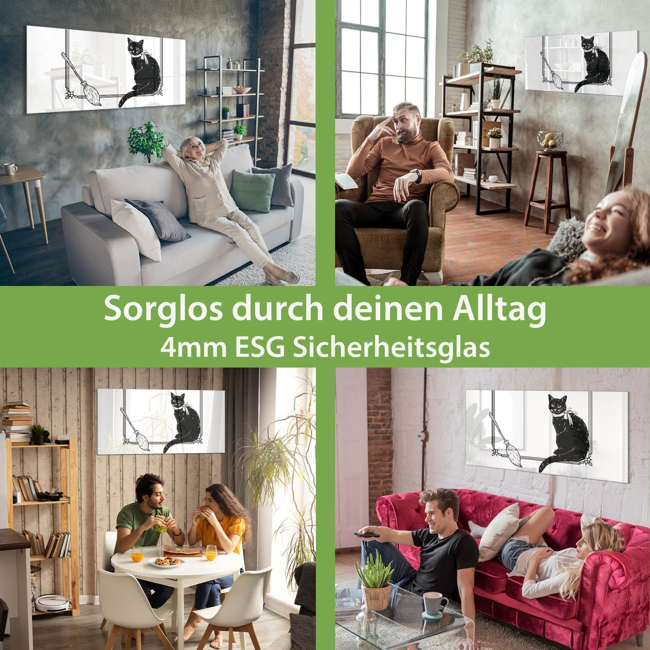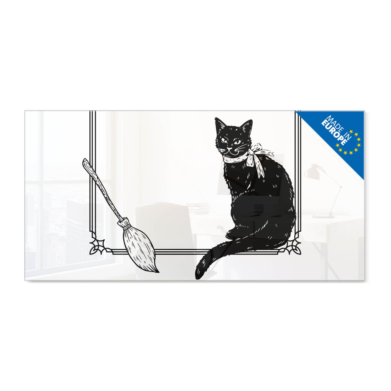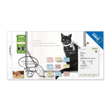 Material: 4mm Sicherheitsglas mit Metallrückwand Eigenschaften: beschreibbar, magnetisch, kratzfest Maße: 100x50x0,6cm, 7,50kg schwer Motiv Nummer 13492 Hexenkater Zubehör: inklusive 4 Neodym-Magnete