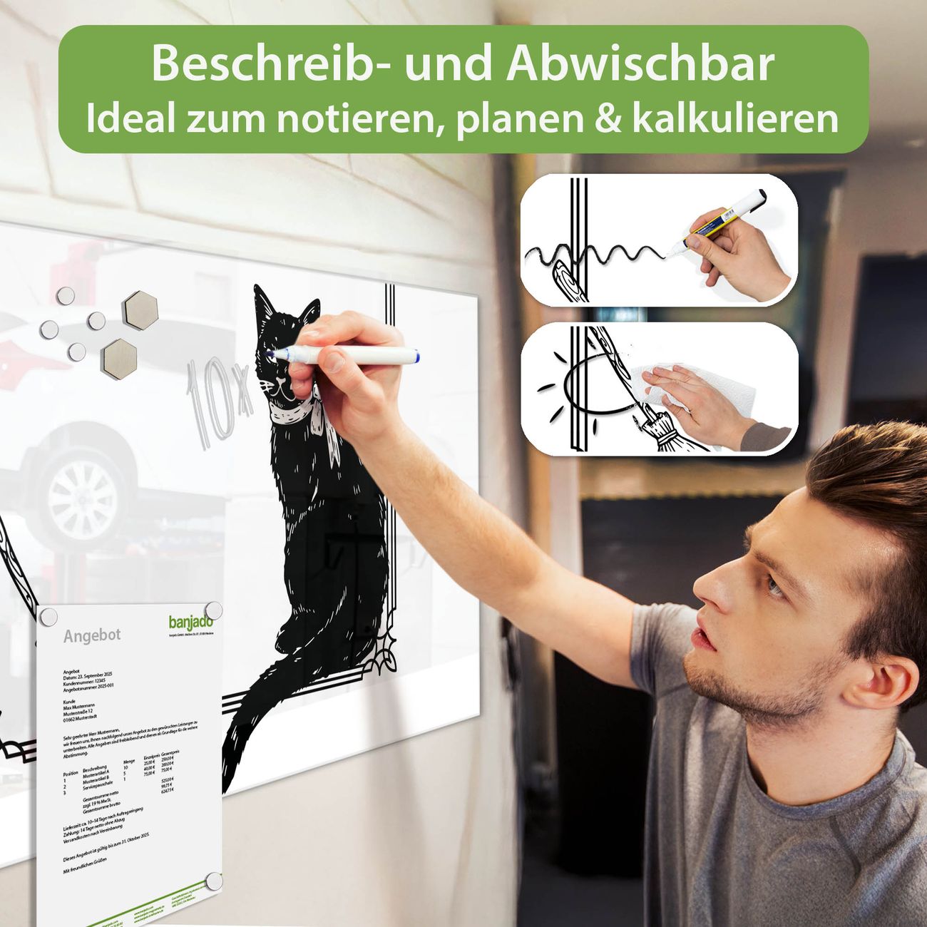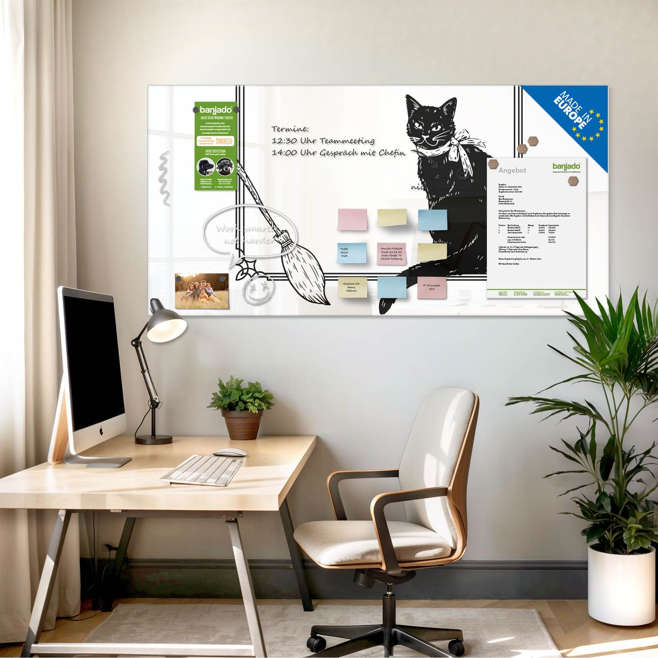 Jede Glas Magnettafel wird in unserer Werkstatt von Hand gefertigt und sorgfältig geprüft. So erhalten Sie ein echtes Qualitätsprodukt, das Funktion und Ästhetik perfekt vereint.?? Warum banjado?
