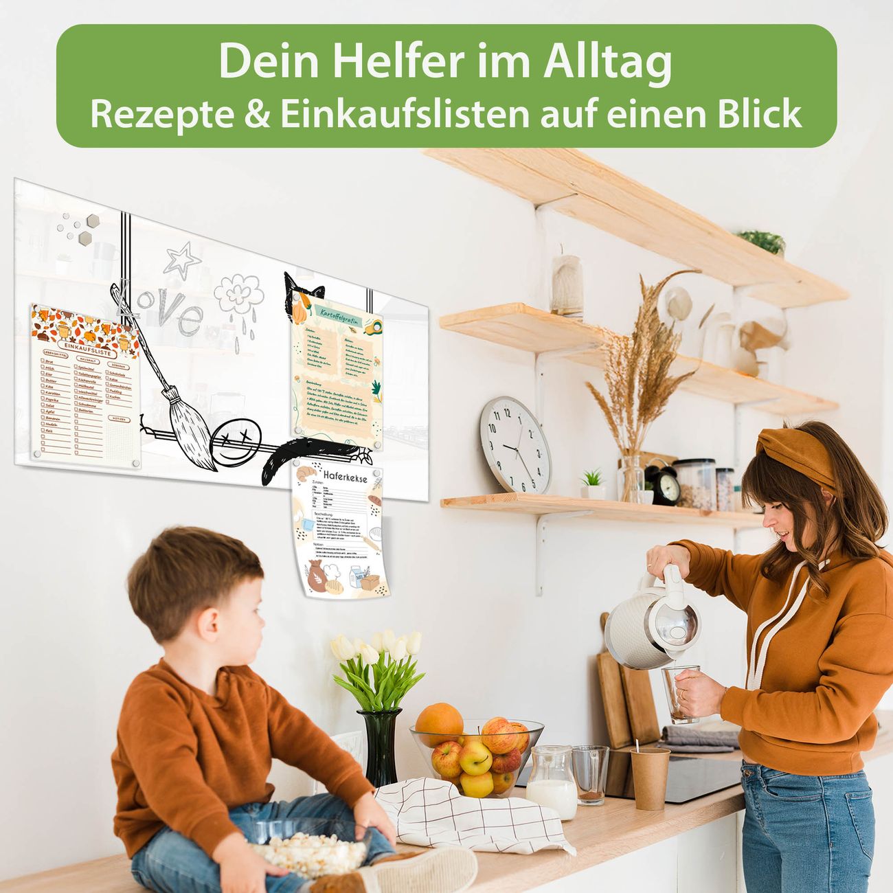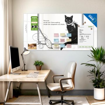 Auf der glatten Glasoberfläche lassen sich Termine, Rezepte oder Notizen ganz einfach mit Kreidestiften festhalten und rückstandslos entfernen. Starke Neodym-Magnete halten Ihre wichtigsten Erinnerungen sicher an Ort und Stelle. So entsteht Ihre ganz persönliche Ideenwand - jeden Tag neu.