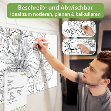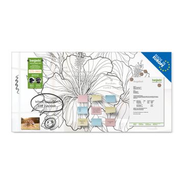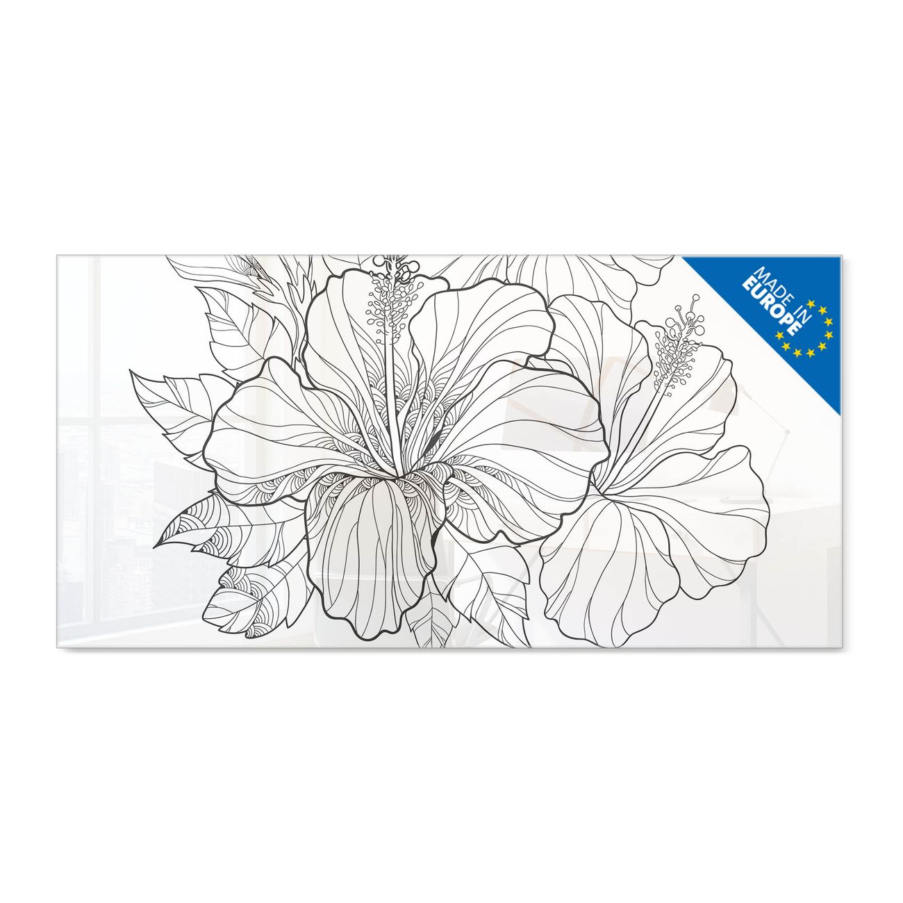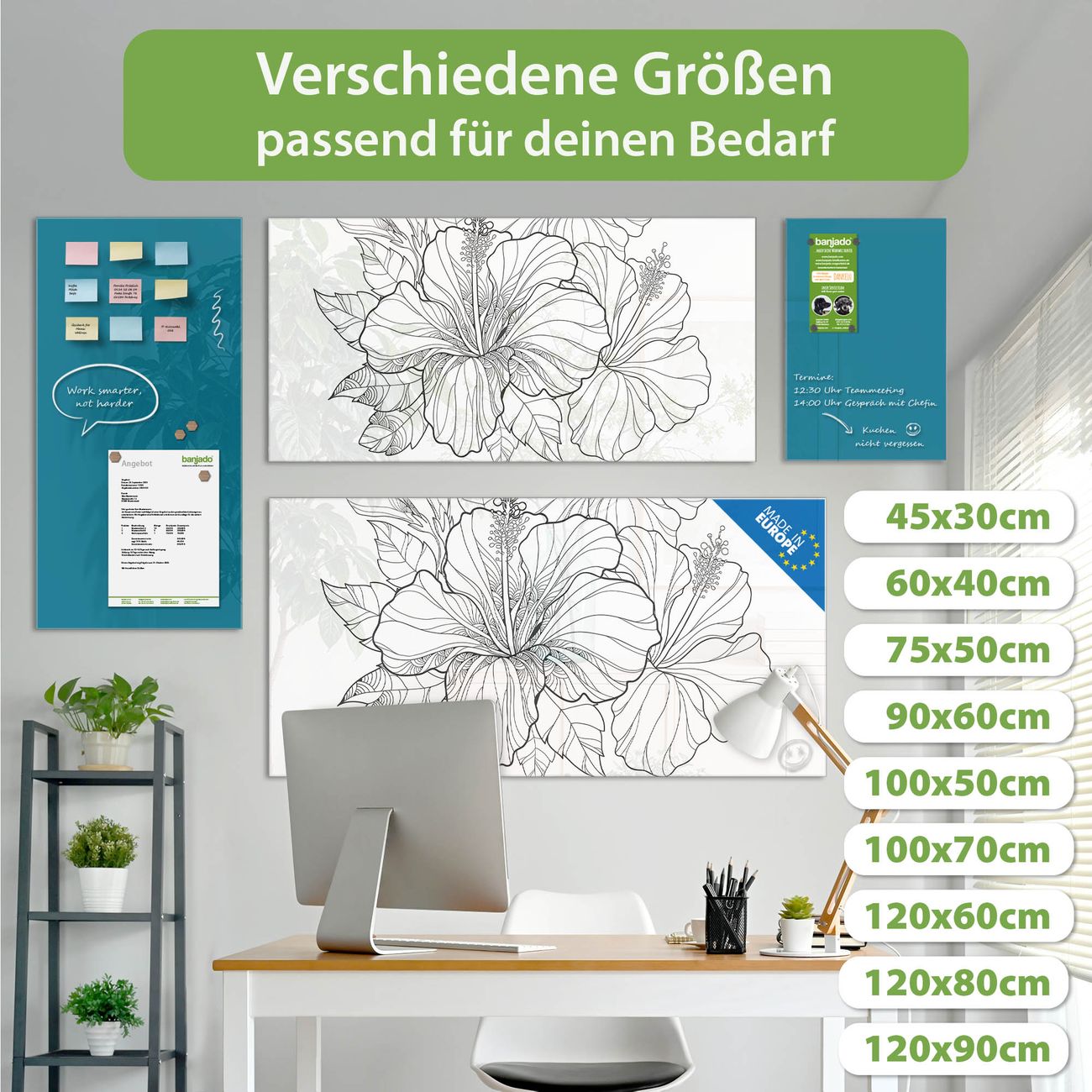 Material: 4mm Sicherheitsglas mit Metallrückwand Eigenschaften: beschreibbar, magnetisch, kratzfest Maße: 100x50x0,6cm, 7,50kg schwer Motiv Nummer 13053 Hibiskus 2 Zubehör: inklusive 4 Neodym-Magnete