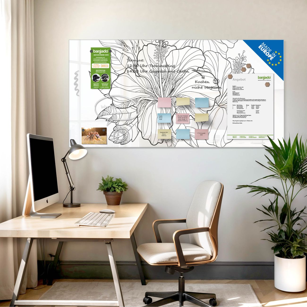 Die banjado Glas Magnettafel mit dem Motiv Motiv Hibiskus 2 verbindet Funktionalität mit Stil. Sie ersetzt das Zettelchaos durch klare Strukturen und bringt dabei eine warme, natürliche Atmosphäre in Ihr Zuhause. Ob im Büro, in der Küche oder im Eingangsbereich - dieses Design-Board zieht Blicke an und sorgt für Ordnung mit Charakter.