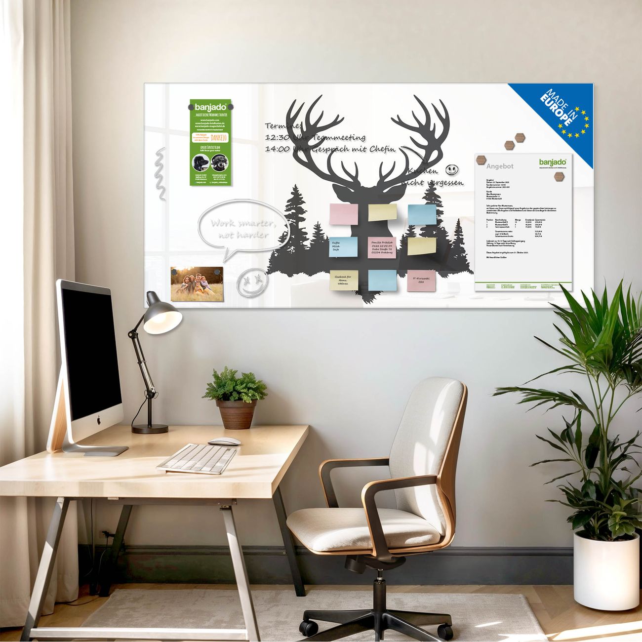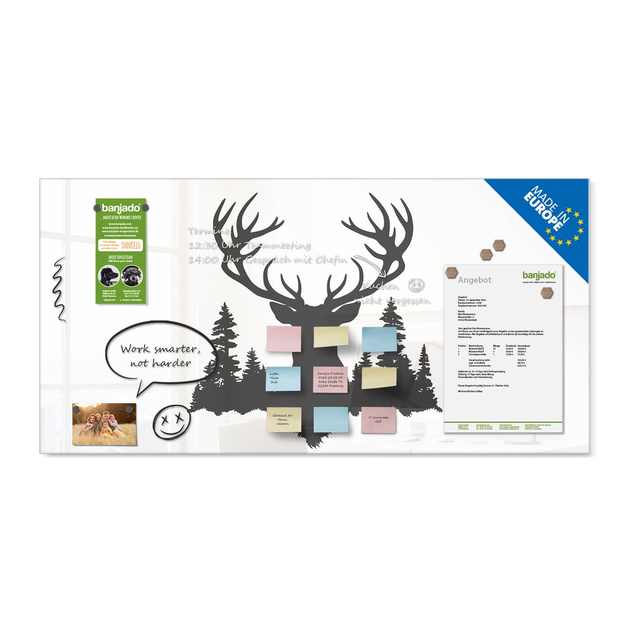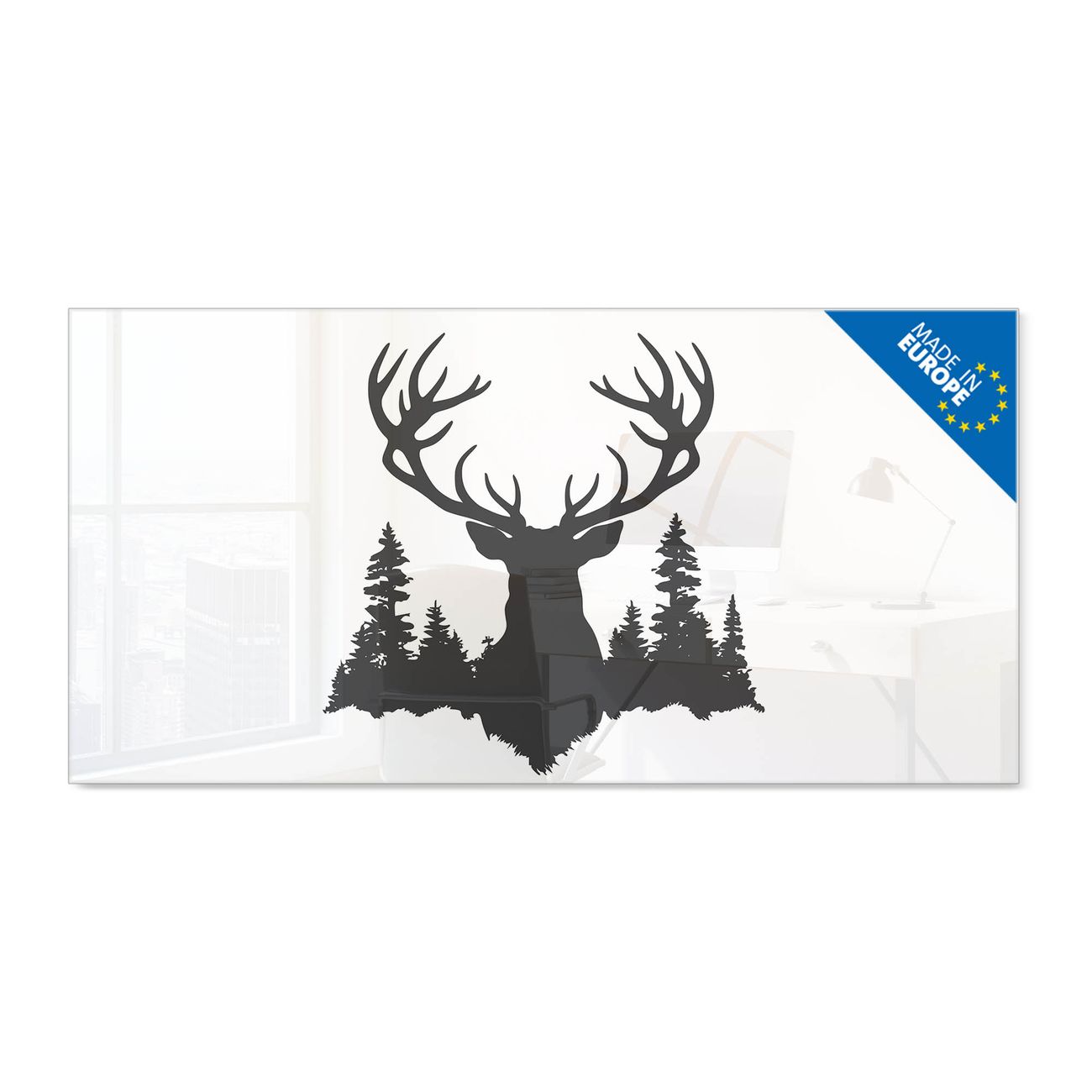 Material: 4mm Sicherheitsglas mit Metallrückwand Eigenschaften: beschreibbar, magnetisch, kratzfest Maße: 100x50x0,6cm, 7,50kg schwer Motiv Nummer 13402 Hirsch im Wald Zubehör: inklusive 4 Neodym-Magnete