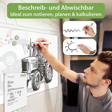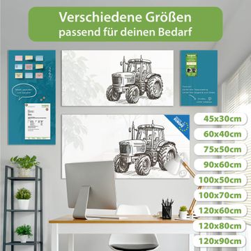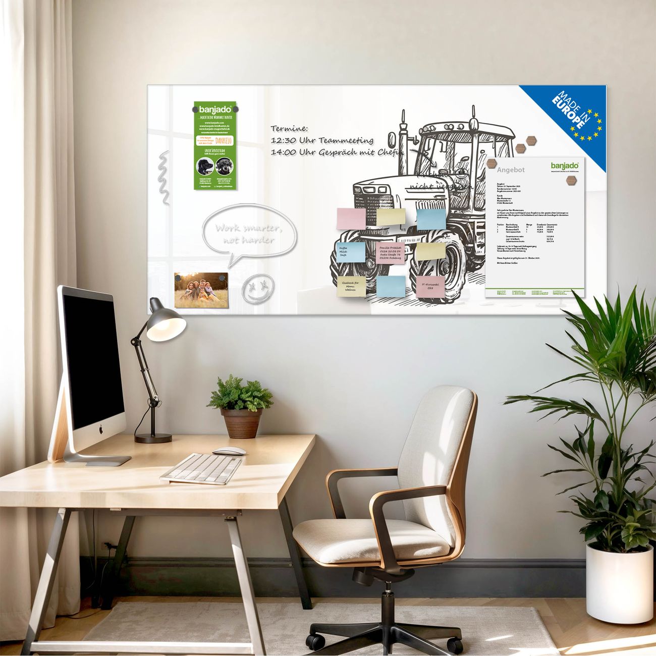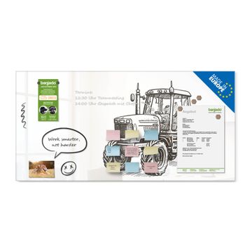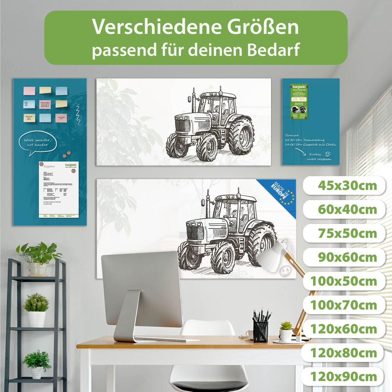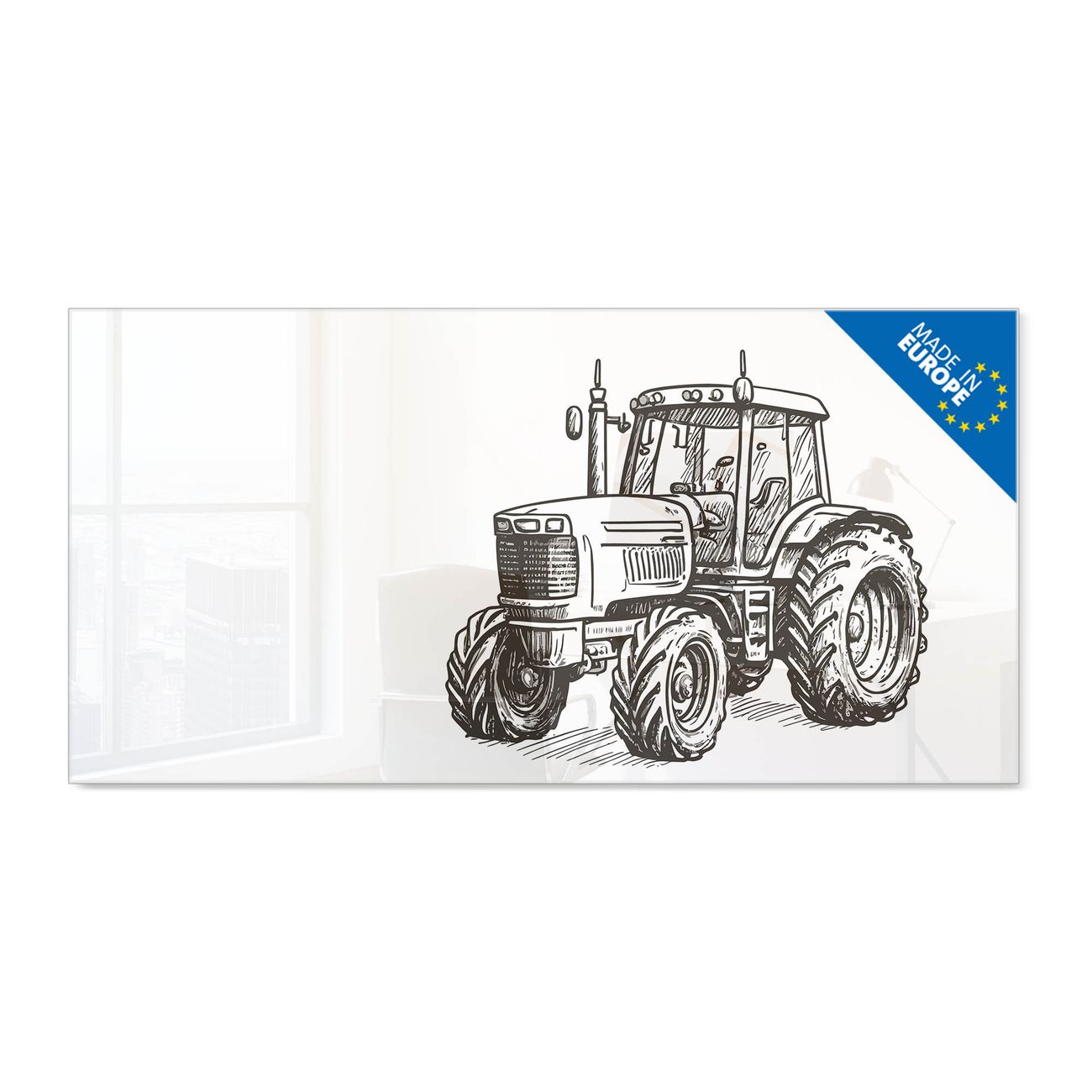 Material: 4mm Sicherheitsglas mit Metallrückwand Eigenschaften: beschreibbar, magnetisch, kratzfest Maße: 100x50x0,6cm, 7,50kg schwer Motiv Nummer 13150 Historischer Traktor Zubehör: inklusive 4 Neodym-Magnete