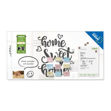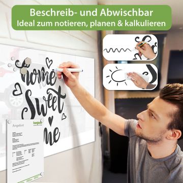 Material: 4mm Sicherheitsglas mit Metallrückwand Eigenschaften: beschreibbar, magnetisch, kratzfest Maße: 100x50x0,6cm, 7,50kg schwer Motiv Nummer 13100 Home sweet Home 3 Zubehör: inklusive 4 Neodym-Magnete