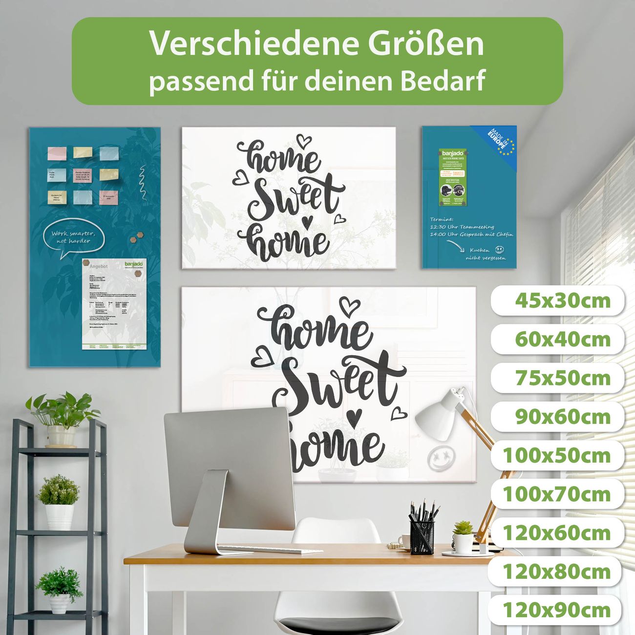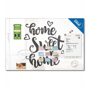 Material: 4mm Sicherheitsglas mit Metallrückwand Eigenschaften: beschreibbar, magnetisch, kratzfest Maße: 120x80x0,6cm, 14,40kg schwer Motiv Nummer 13100 Home sweet Home 3 Zubehör: inklusive 4 Neodym-Magnete