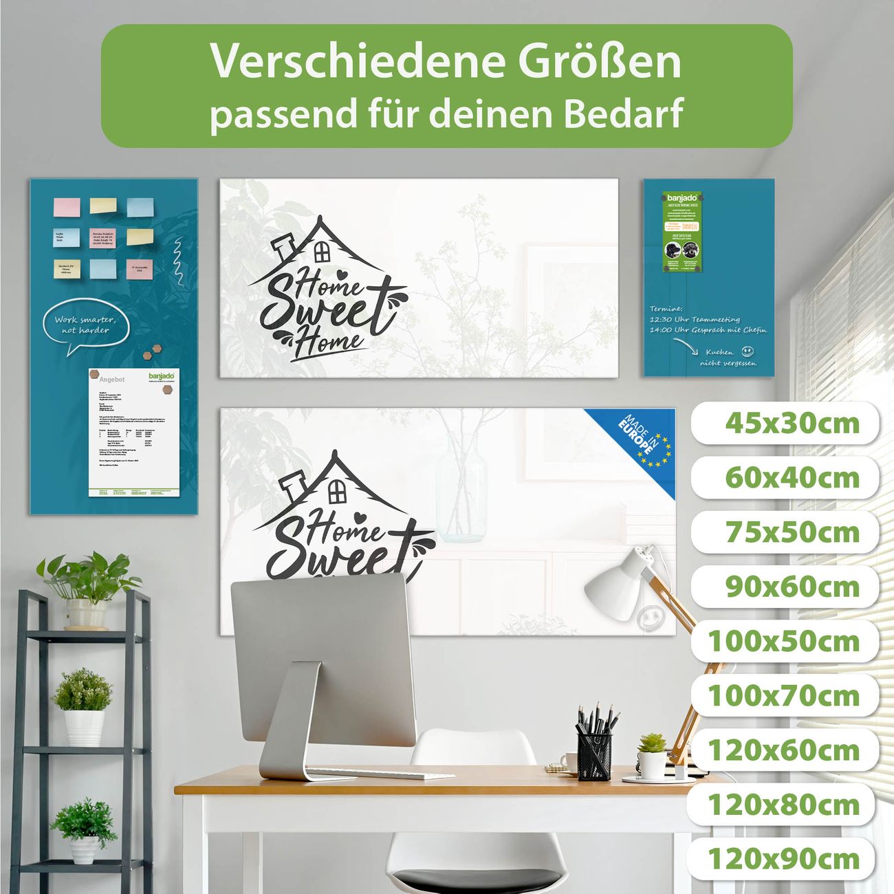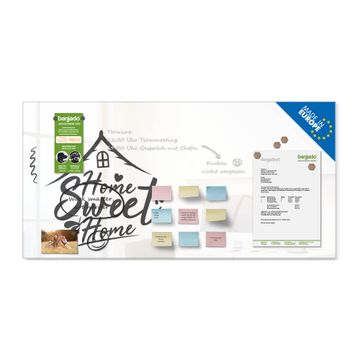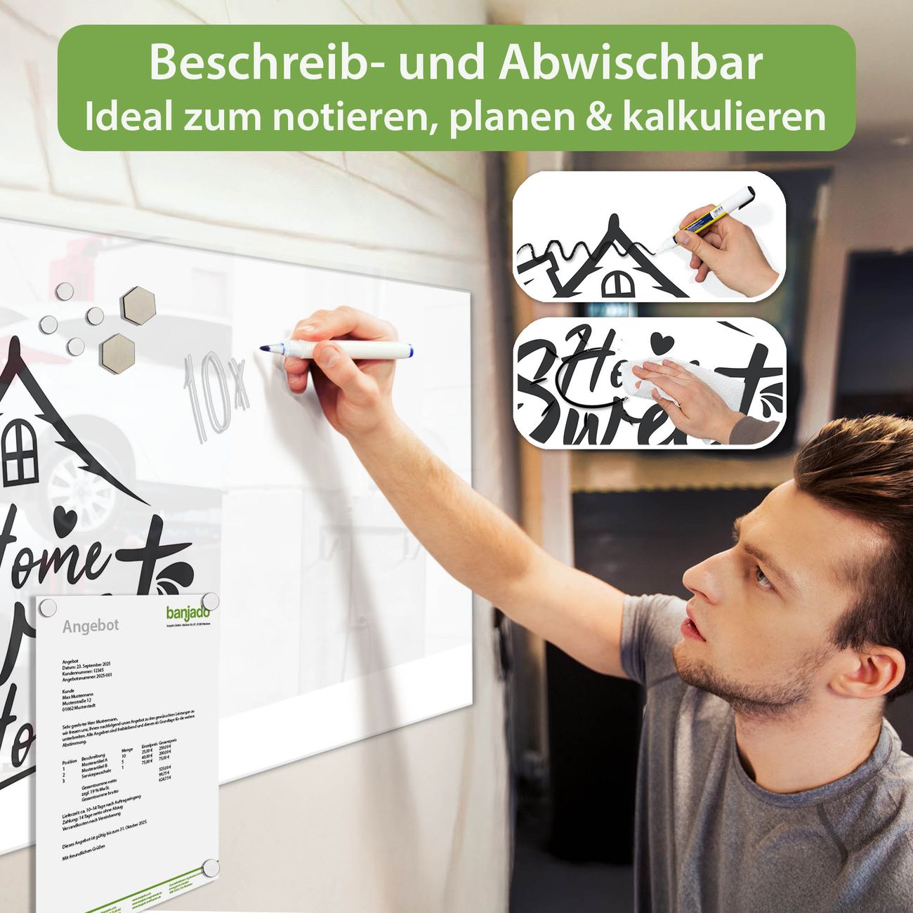 Material: 4mm Sicherheitsglas mit Metallrückwand Eigenschaften: beschreibbar, magnetisch, kratzfest Maße: 100x50x0,6cm, 7,50kg schwer Motiv Nummer 13101 Home sweet Home 4 Zubehör: inklusive 4 Neodym-Magnete