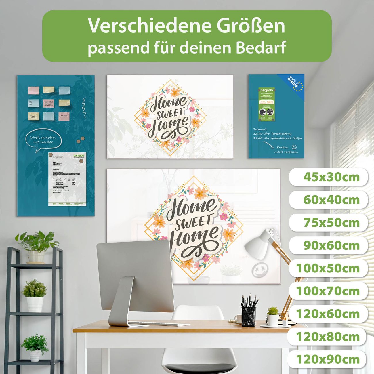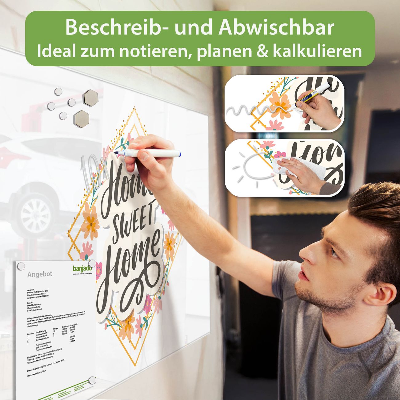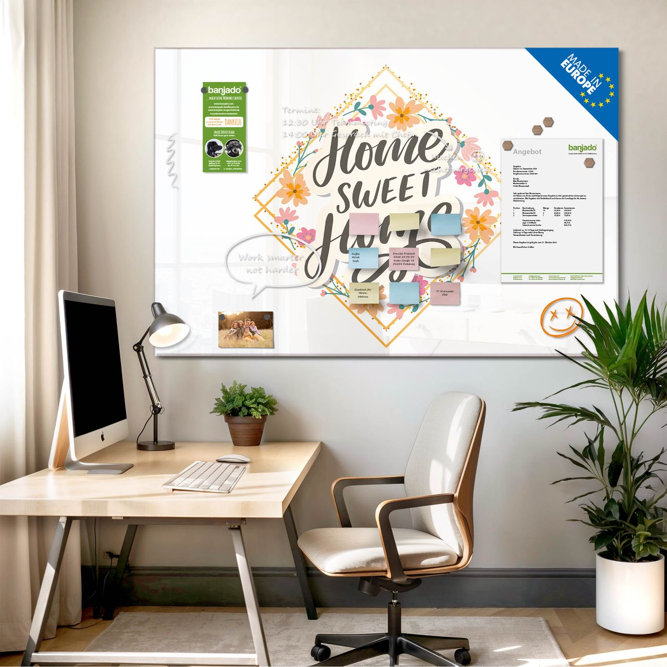 Die banjado Glas Magnettafel mit dem Motiv Motiv Home Sweet Home Schild verbindet Funktionalität mit Stil. Sie ersetzt das Zettelchaos durch klare Strukturen und bringt dabei eine warme, natürliche Atmosphäre in Ihr Zuhause. Ob im Büro, in der Küche oder im Eingangsbereich - dieses Design-Board zieht Blicke an und sorgt für Ordnung mit Charakter.