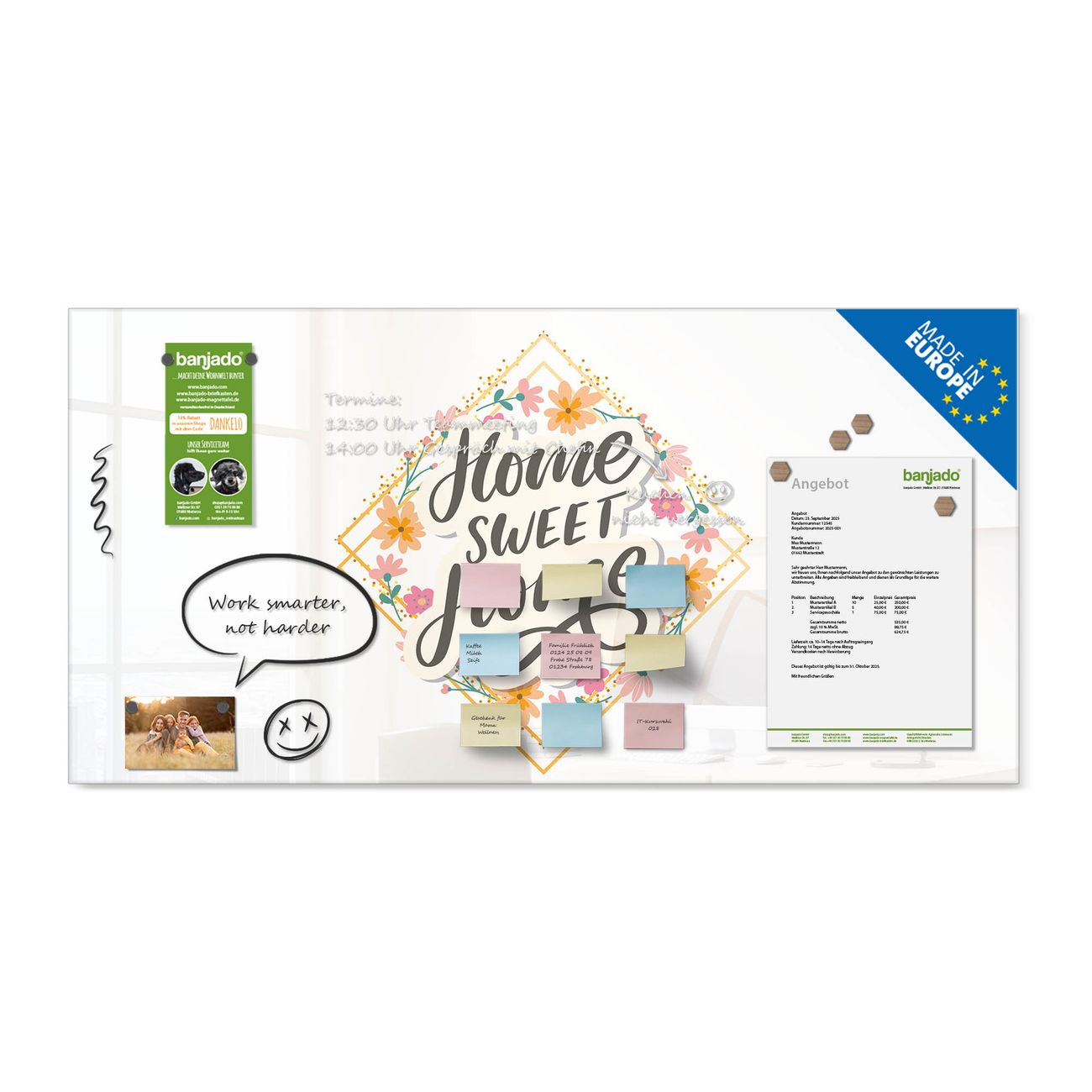 Material: 4mm Sicherheitsglas mit Metallrückwand Eigenschaften: beschreibbar, magnetisch, kratzfest Maße: 120x60x0,6cm, 10,80kg schwer Motiv Nummer 13397 Home Sweet Home Schild Zubehör: inklusive 4 Neodym-Magnete