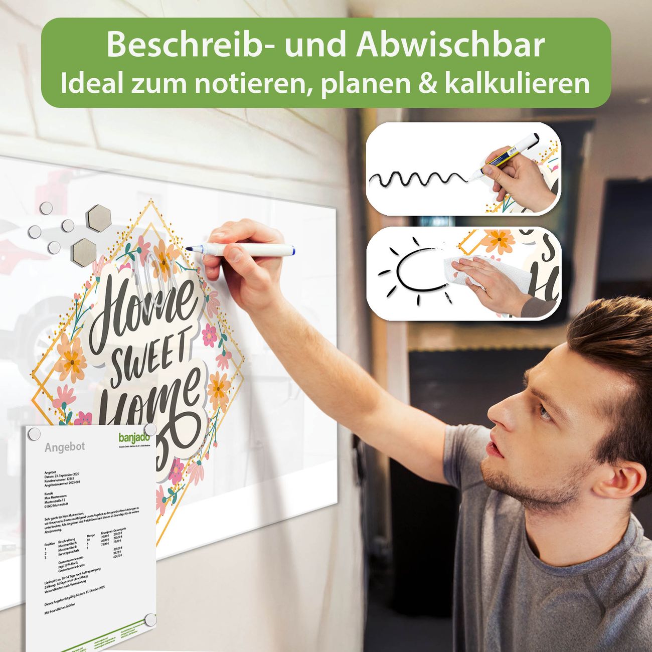 Die banjado Glas Magnettafel mit dem Motiv Motiv Home Sweet Home Schild verbindet Funktionalität mit Stil. Sie ersetzt das Zettelchaos durch klare Strukturen und bringt dabei eine warme, natürliche Atmosphäre in Ihr Zuhause. Ob im Büro, in der Küche oder im Eingangsbereich - dieses Design-Board zieht Blicke an und sorgt für Ordnung mit Charakter.