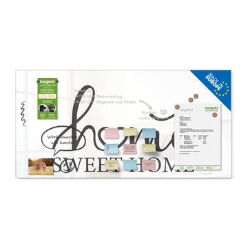 Material: 4mm Sicherheitsglas mit Metallrückwand Eigenschaften: beschreibbar, magnetisch, kratzfest Maße: 100x50x0,6cm, 7,50kg schwer Motiv Nummer 13398 Home Sweet Home Schriftzug Zubehör: inklusive 4 Neodym-Magnete