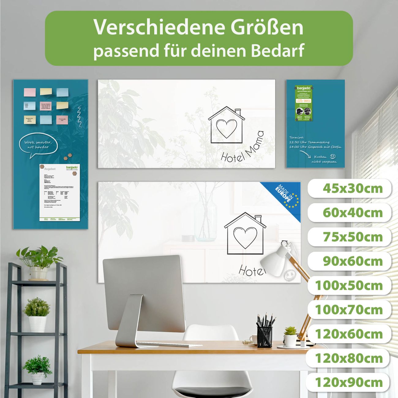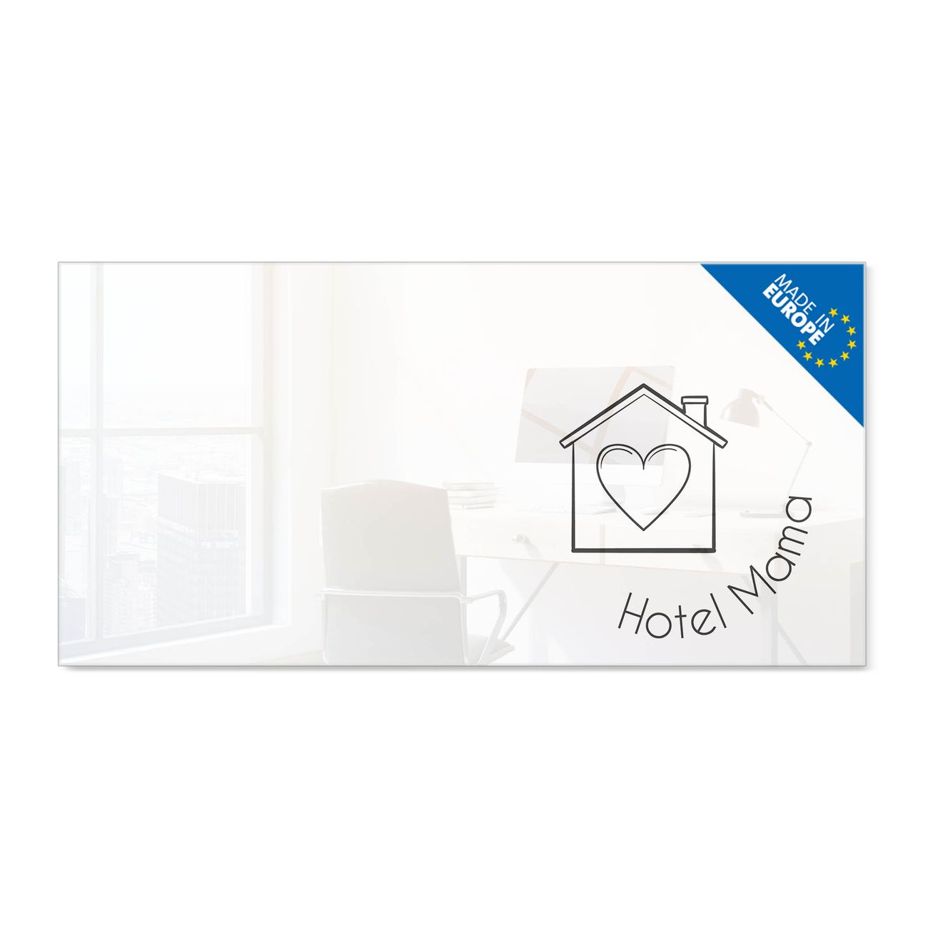 Material: 4mm Sicherheitsglas mit Metallrückwand Eigenschaften: beschreibbar, magnetisch, kratzfest Maße: 100x50x0,6cm, 7,50kg schwer Motiv Nummer 13106 Hotel Mama Haus mit Herz 2 Zubehör: inklusive 4 Neodym-Magnete