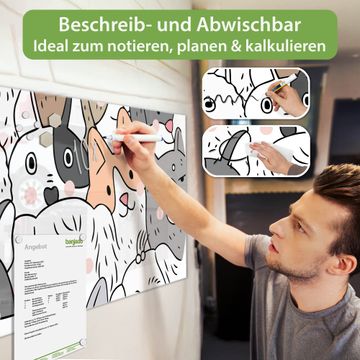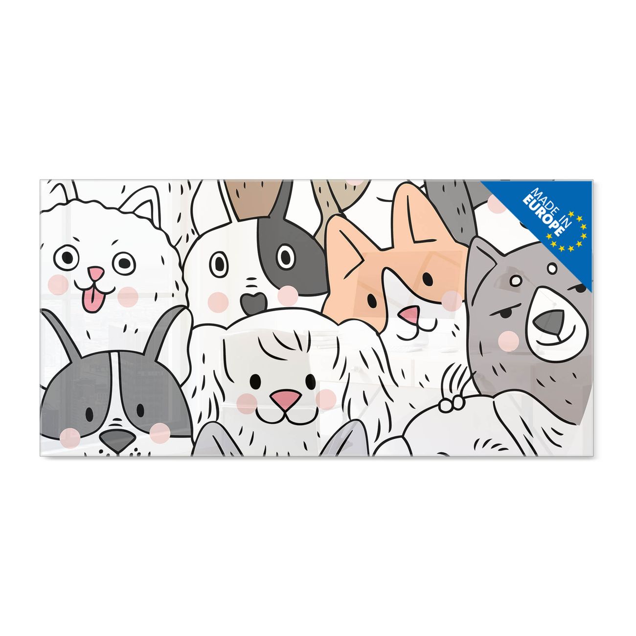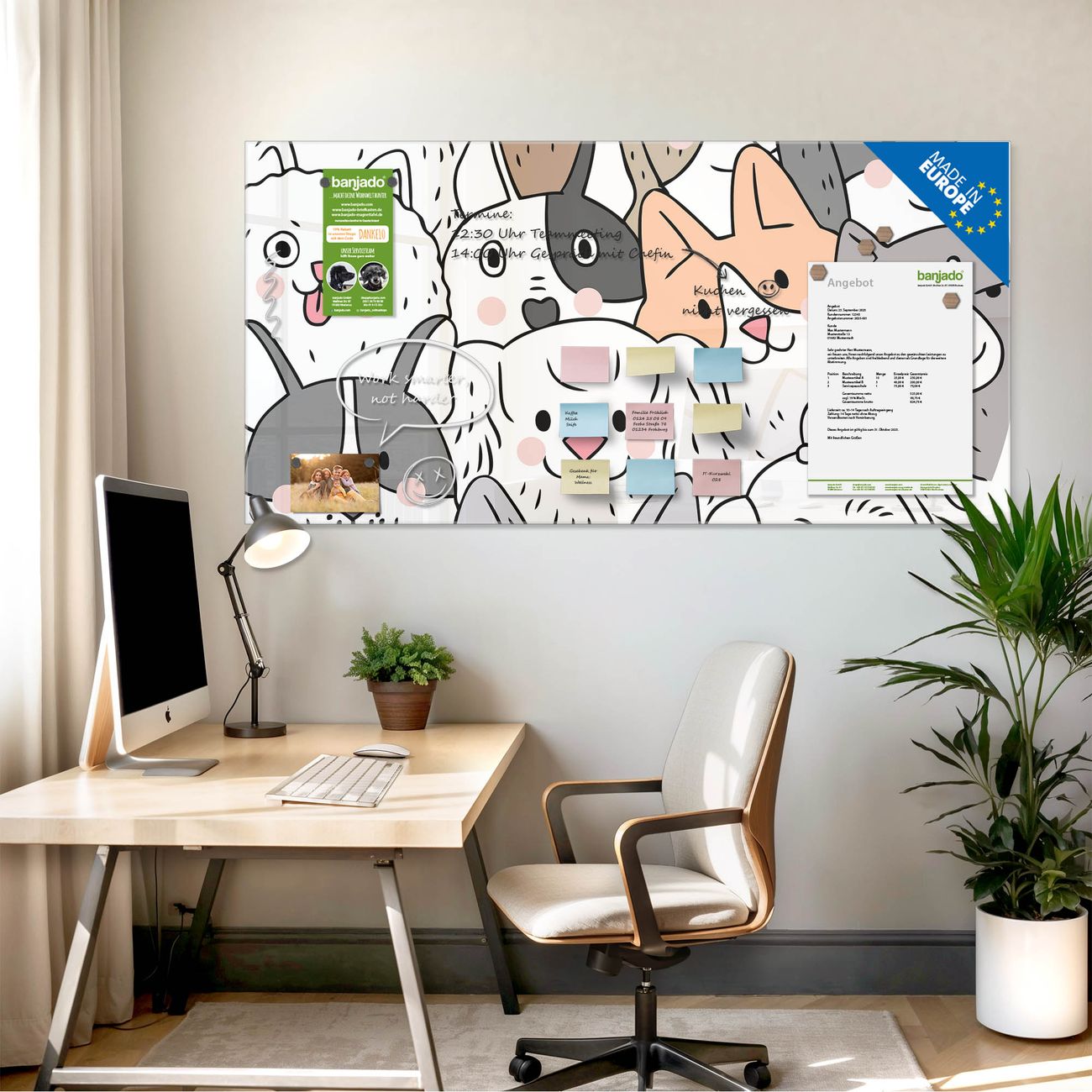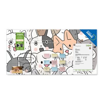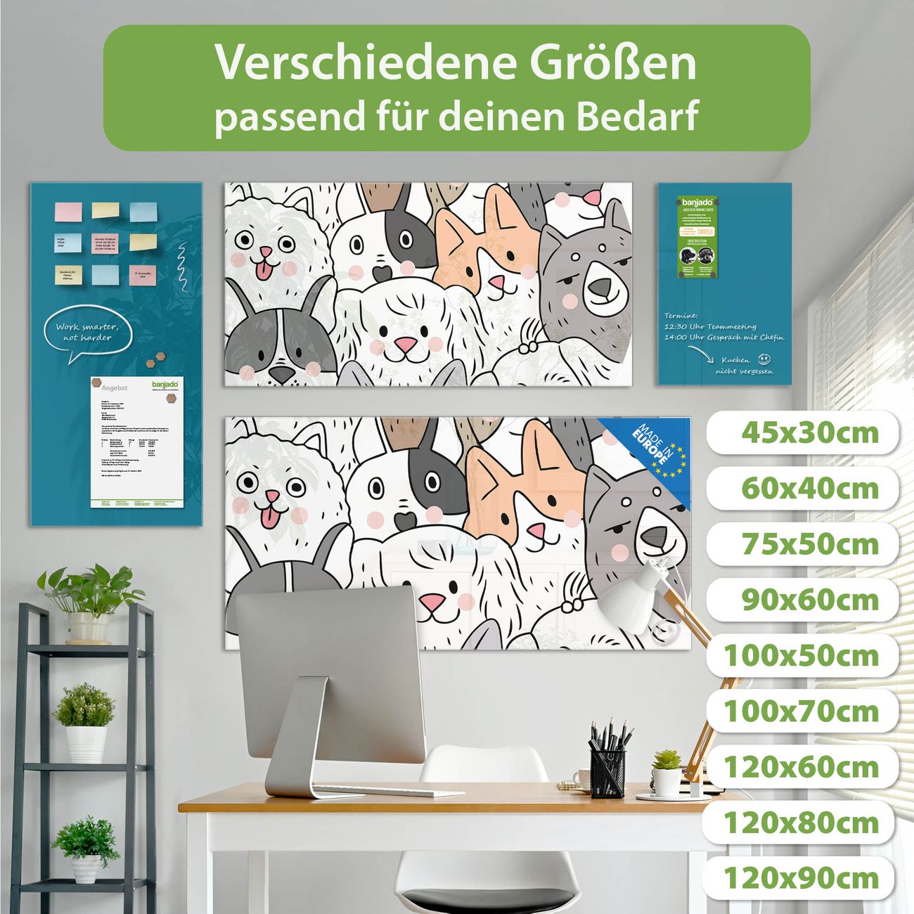 Material: 4mm Sicherheitsglas mit Metallrückwand Eigenschaften: beschreibbar, magnetisch, kratzfest Maße: 100x50x0,6cm, 7,50kg schwer Motiv Nummer 13430 Hundefreunde Zubehör: inklusive 4 Neodym-Magnete