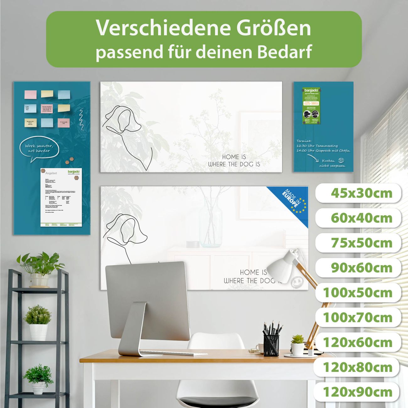 Material: 4mm Sicherheitsglas mit Metallrückwand Eigenschaften: beschreibbar, magnetisch, kratzfest Maße: 100x50x0,6cm, 7,50kg schwer Motiv Nummer 13496 Hundeheimat Zubehör: inklusive 4 Neodym-Magnete