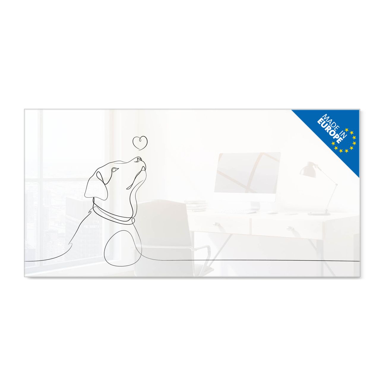 Material: 4mm Sicherheitsglas mit Metallrückwand Eigenschaften: beschreibbar, magnetisch, kratzfest Maße: 100x50x0,6cm, 7,50kg schwer Motiv Nummer 13048 Hundeliebe 2 Zubehör: inklusive 4 Neodym-Magnete