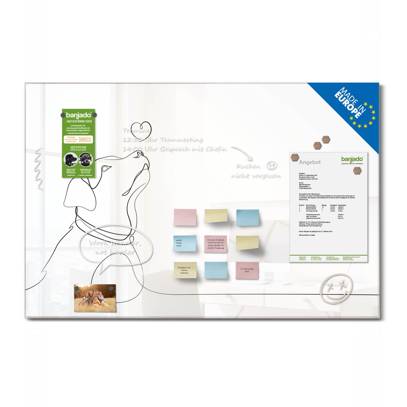Material: 4mm Sicherheitsglas mit Metallrückwand Eigenschaften: beschreibbar, magnetisch, kratzfest Maße: 120x80x0,6cm, 14,40kg schwer Motiv Nummer 13048 Hundeliebe 2 Zubehör: inklusive 4 Neodym-Magnete