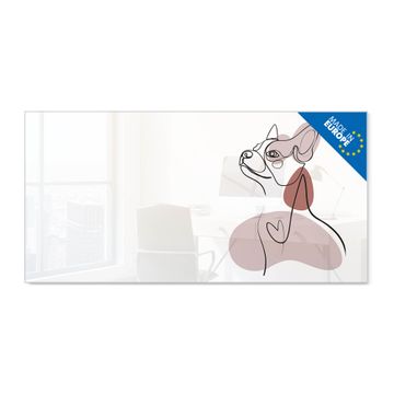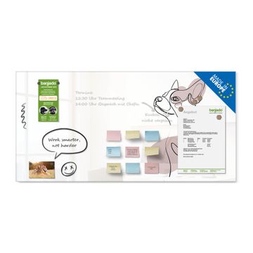 Material: 4mm Sicherheitsglas mit Metallrückwand Eigenschaften: beschreibbar, magnetisch, kratzfest Maße: 100x50x0,6cm, 7,50kg schwer Motiv Nummer 13303 Hundeporträt Zubehör: inklusive 4 Neodym-Magnete