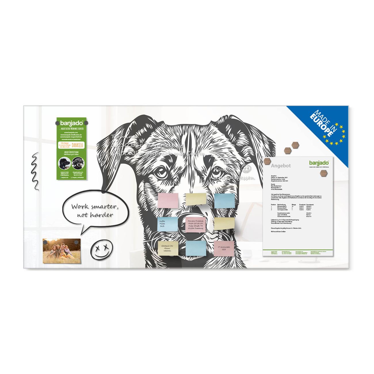 Ein Stück Design, das Ihren Alltag organisiert. Schreiben, heften, inspirieren - alles an einem Ort. Qualität, die man spürt. Montage leicht gemacht. Handwerk mit Herz - veredelt in Sachsen. Einzigartiges Design mit Motiv Motiv Hundeskizze Beschreibbare Glasoberfläche, leicht zu reinigen Starke Magnetkraft durch Stahlrückwand Inklusive 4 Neodym-Magneten Flexible Montageoptionen Handveredelt in Sachsen - Qualität, die bleibt