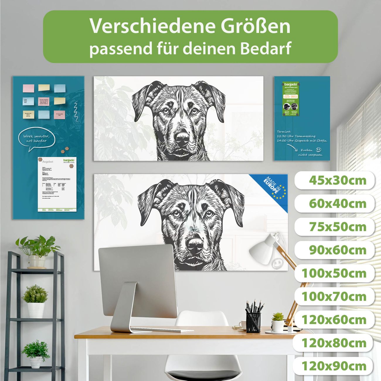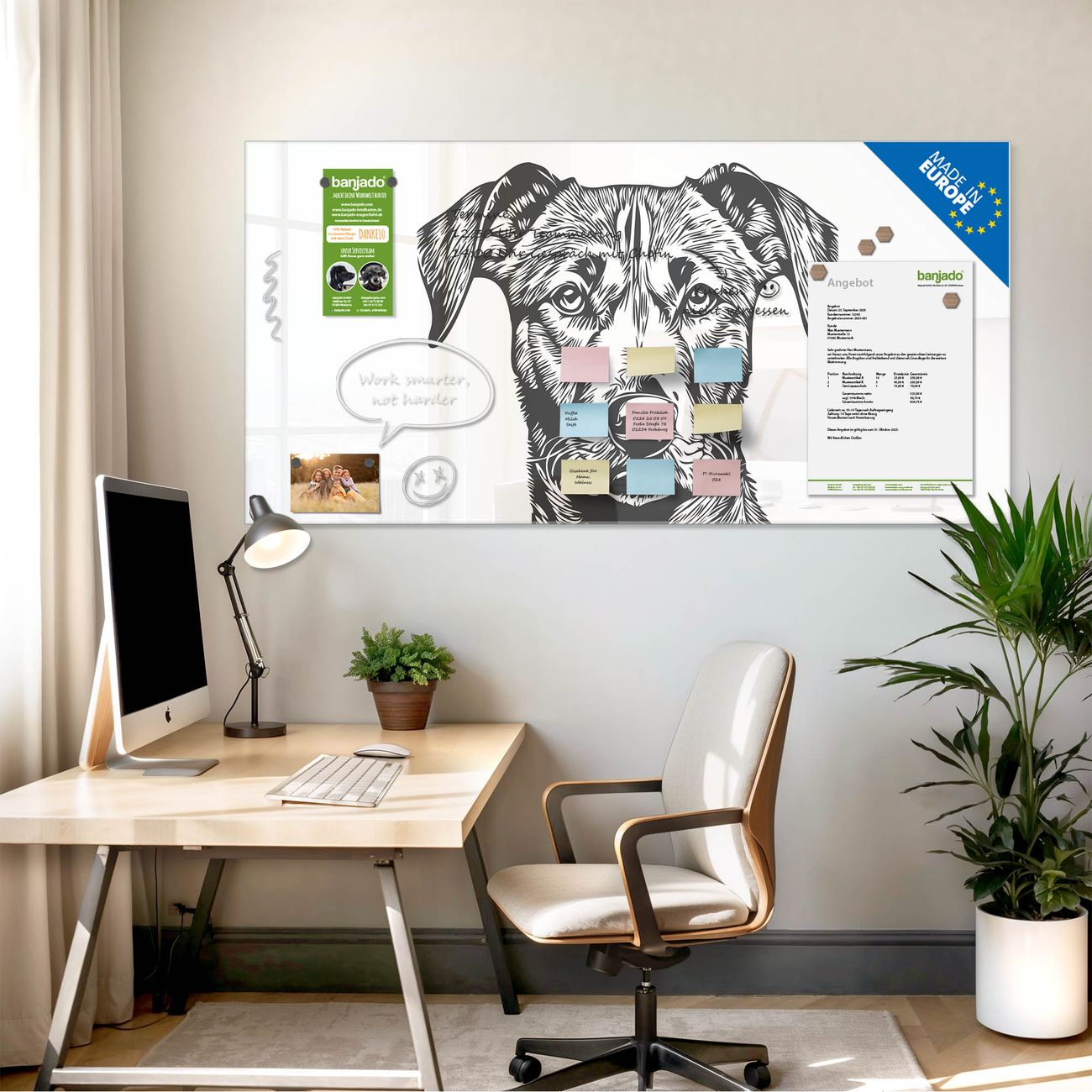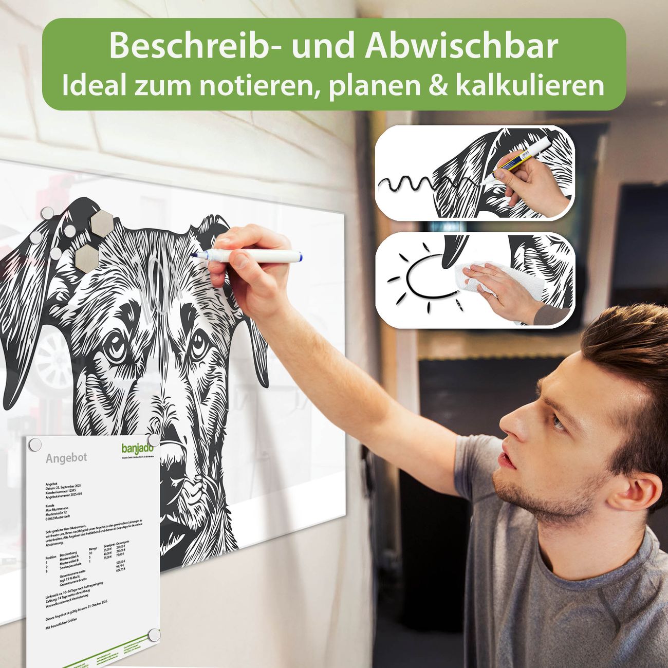 Jede Glas Magnettafel wird in unserer Werkstatt von Hand gefertigt und sorgfältig geprüft. So erhalten Sie ein echtes Qualitätsprodukt, das Funktion und Ästhetik perfekt vereint.?? Warum banjado?
