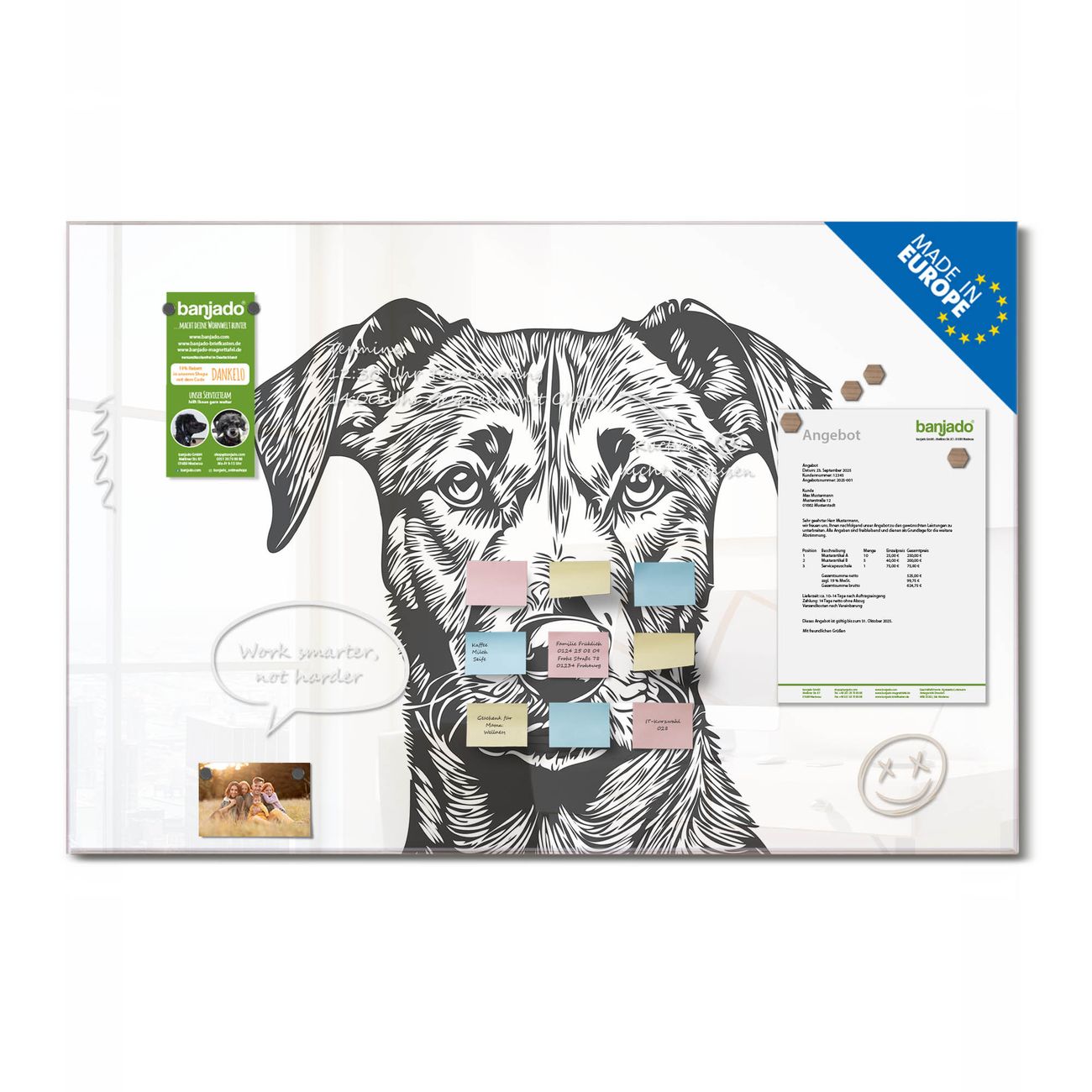 Ein Stück Design, das Ihren Alltag organisiert. Schreiben, heften, inspirieren - alles an einem Ort. Qualität, die man spürt. Montage leicht gemacht. Handwerk mit Herz - veredelt in Sachsen. Einzigartiges Design mit Motiv Motiv Hundeskizze Beschreibbare Glasoberfläche, leicht zu reinigen Starke Magnetkraft durch Stahlrückwand Inklusive 4 Neodym-Magneten Flexible Montageoptionen Handveredelt in Sachsen - Qualität, die bleibt