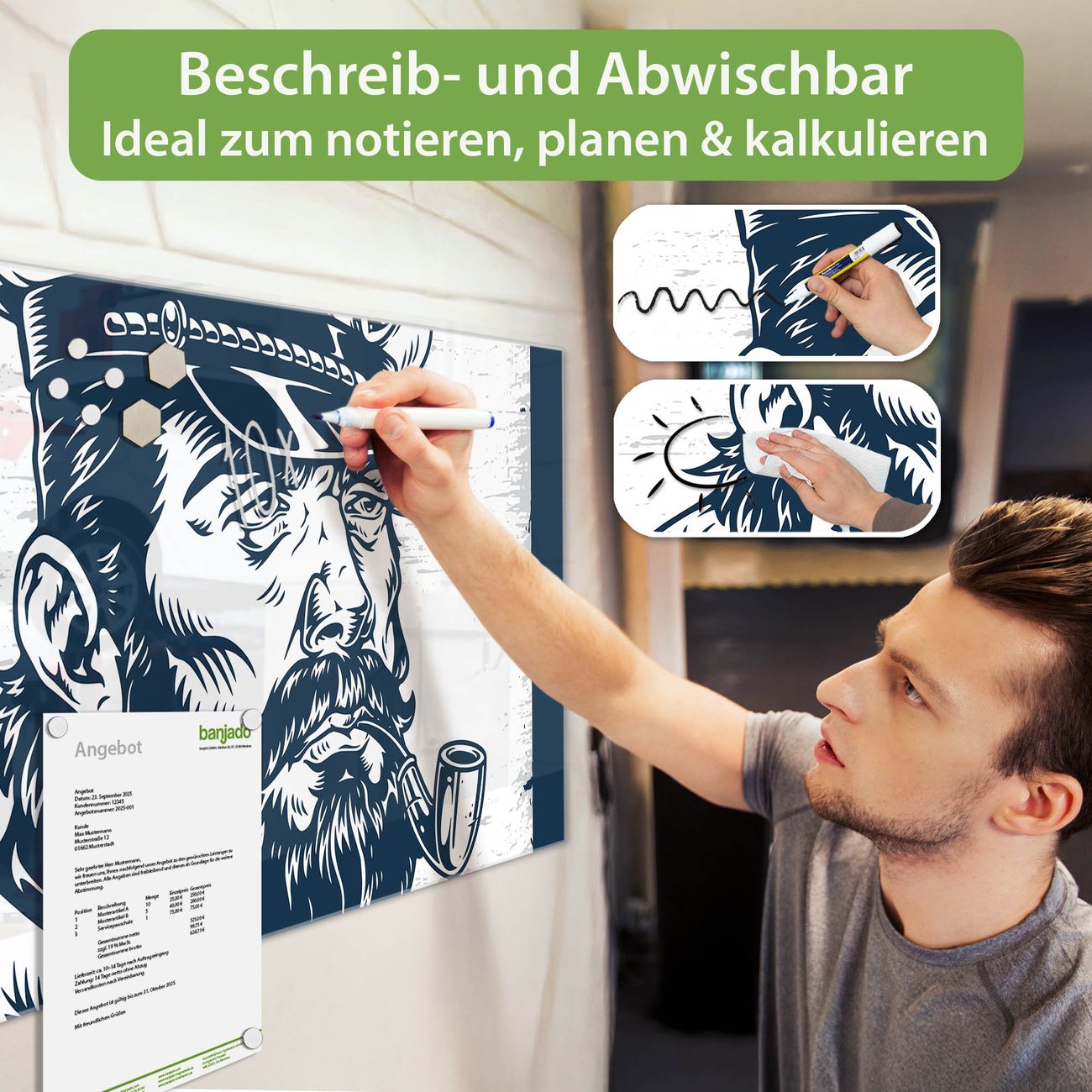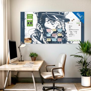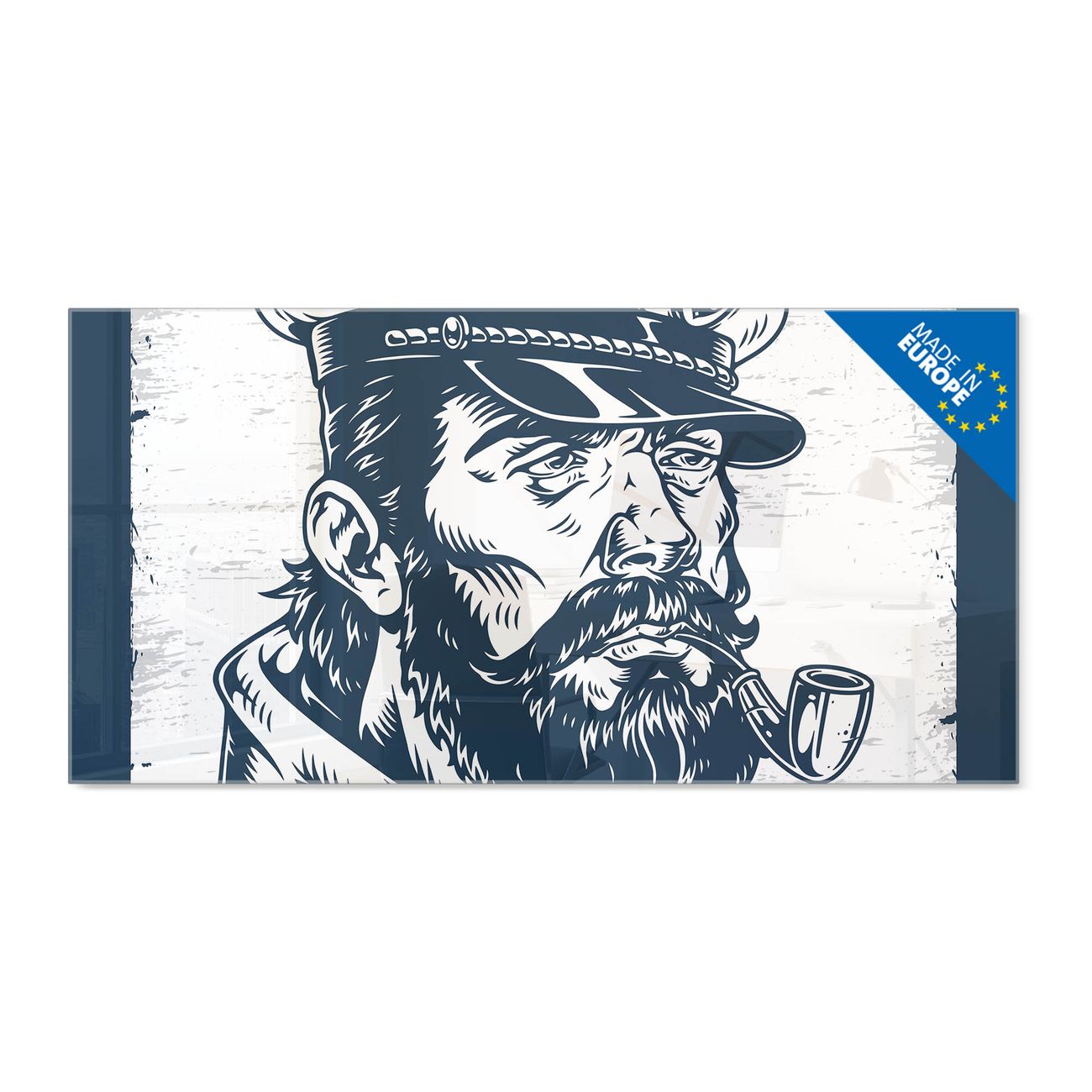 Material: 4mm Sicherheitsglas mit Metallrückwand Eigenschaften: beschreibbar, magnetisch, kratzfest Maße: 100x50x0,6cm, 7,50kg schwer Motiv Nummer 13339 Kapitän Portrait Zubehör: inklusive 4 Neodym-Magnete