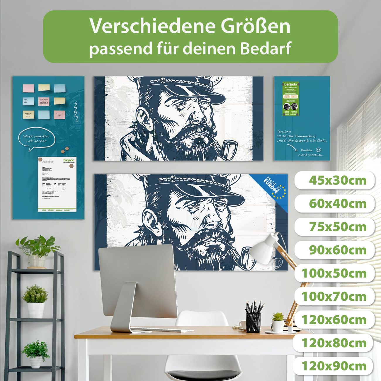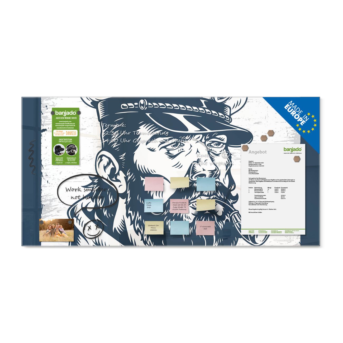 Ein Stück Design, das Ihren Alltag organisiert. Schreiben, heften, inspirieren - alles an einem Ort. Qualität, die man spürt. Montage leicht gemacht. Handwerk mit Herz - veredelt in Sachsen. Einzigartiges Design mit Motiv Motiv Kapitän Portrait Beschreibbare Glasoberfläche, leicht zu reinigen Starke Magnetkraft durch Stahlrückwand Inklusive 4 Neodym-Magneten Flexible Montageoptionen Handveredelt in Sachsen - Qualität, die bleibt